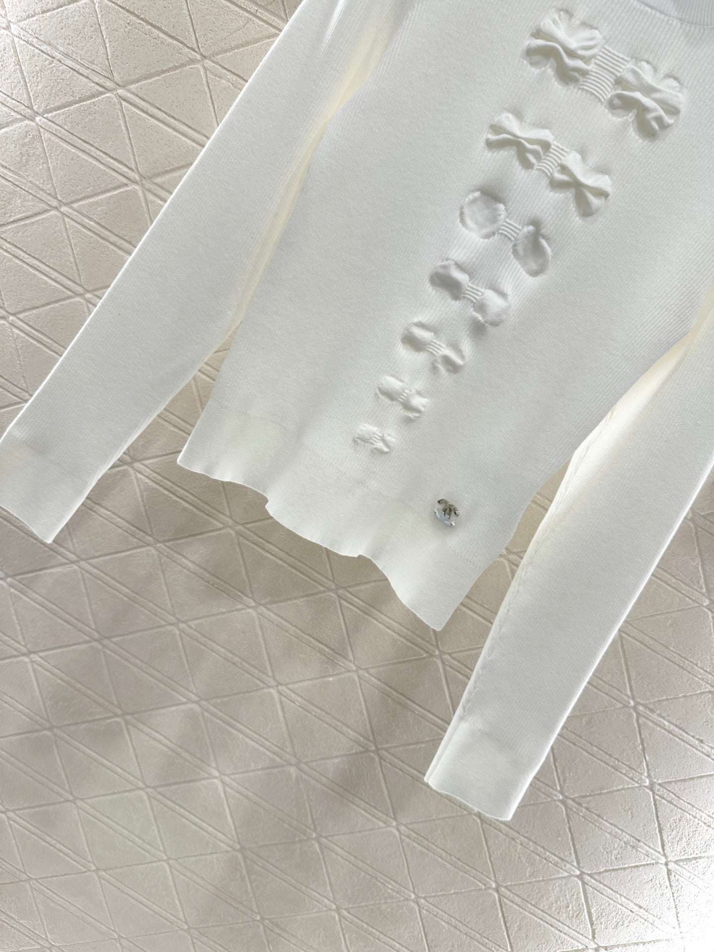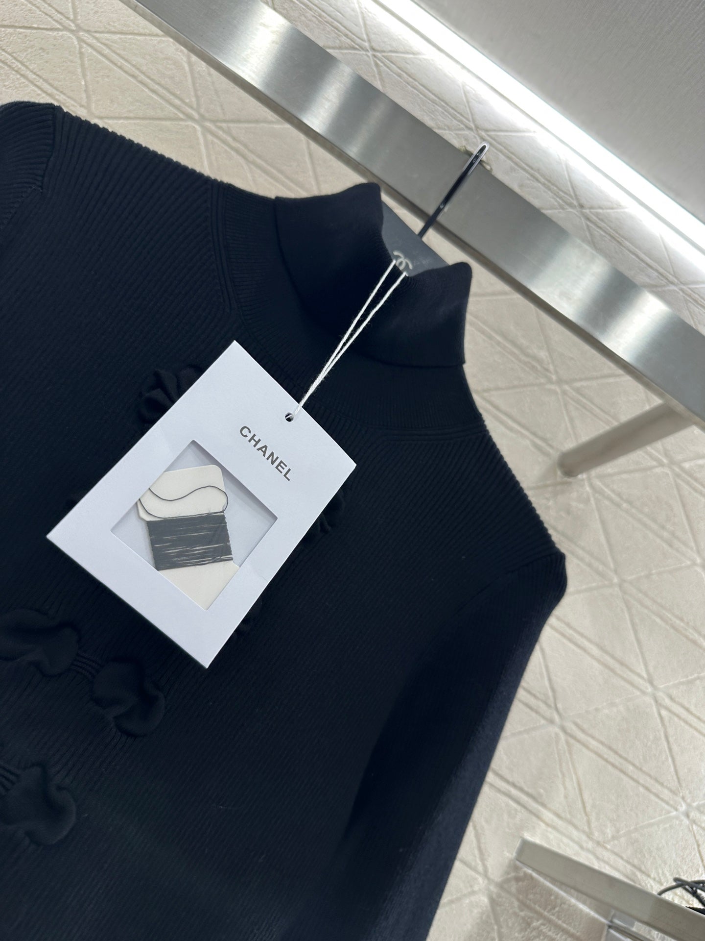 Cotton yarn weaving, soft and delicate, comfortable texture, high necked knitted long sleeves, decorated with concave and convex textures from top to bottom to create bow decorations, rich design layers, combined with threaded elastic edging for a more slimming effect. The double C-letter logo at the hem shows the brand tone, low-key and textured, elastic fabric, fits the body, and exudes elegance and generosity on the upper body