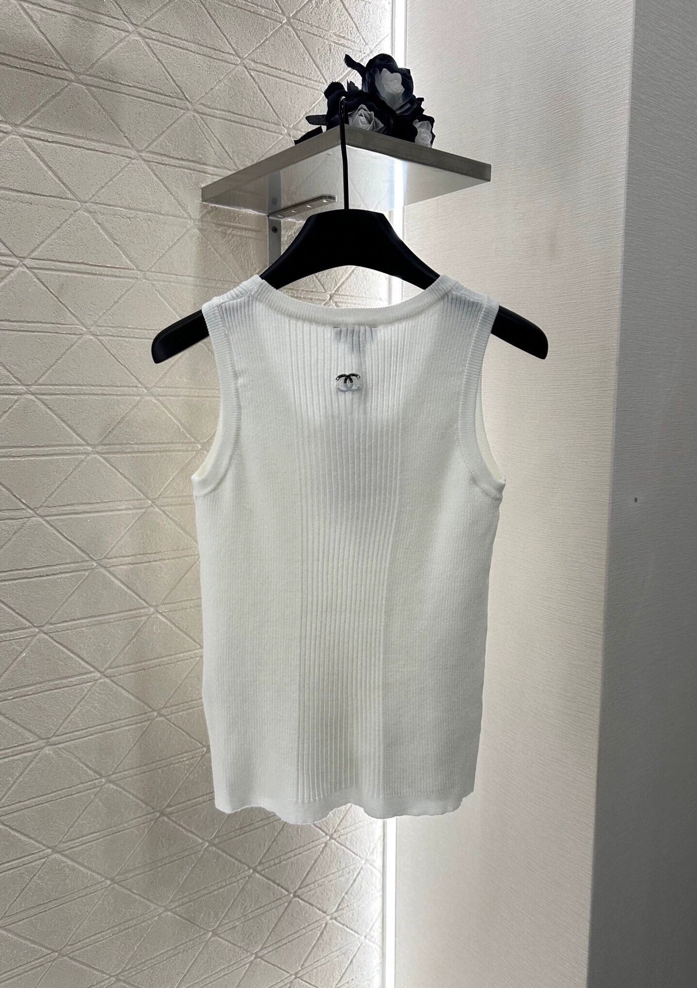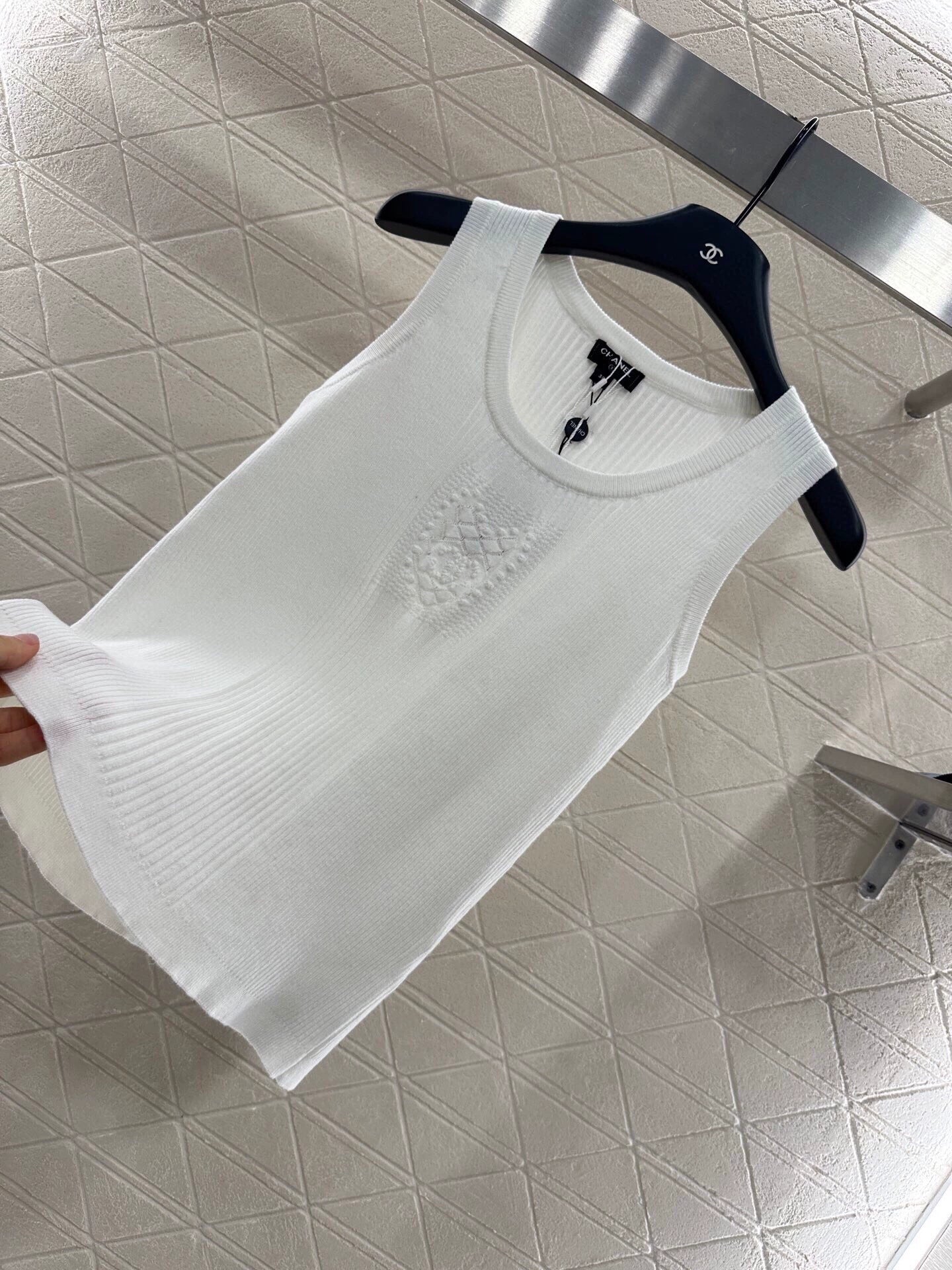 Custom YB wool yarn weaving, breathable and comfortable, full of texture. Knitted vest cut, light and breathable, more suitable for summer. The heart double C letter pattern on the chest is colorful and layered. The double C metal label on the back echoes the brand style. The garment has a slight stretch to create a slimming visual effect. It looks stylish when worn alone or with an inner layer.