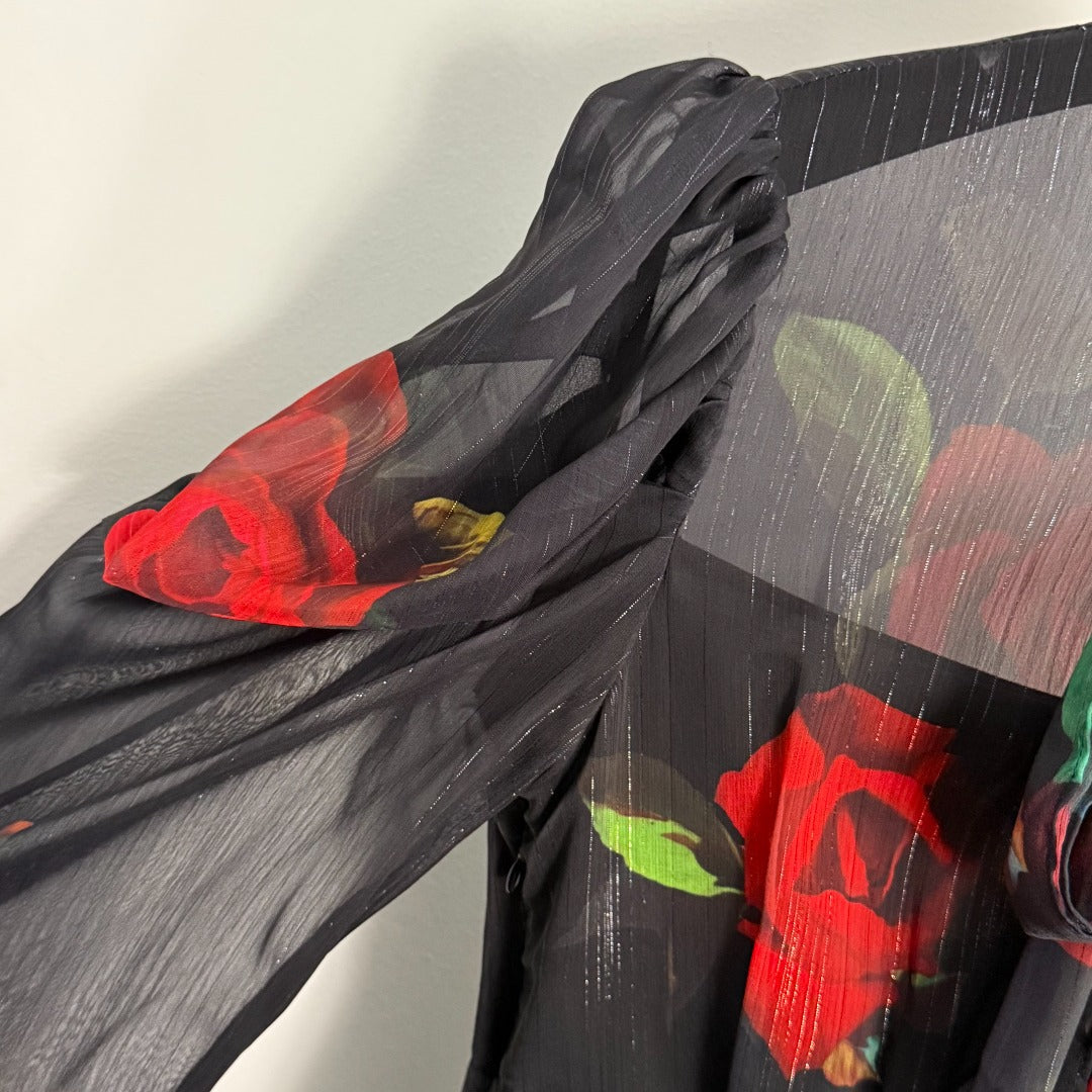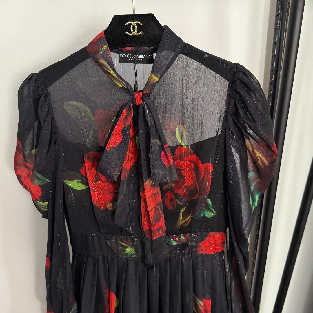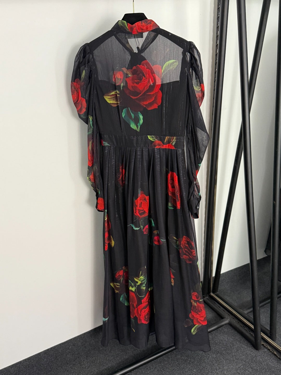 Red rose print, elegant bow tie collar, bubble long sleeves, the upper body is slim and slim, super temperament
