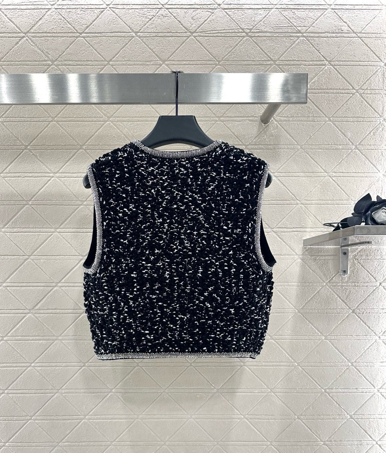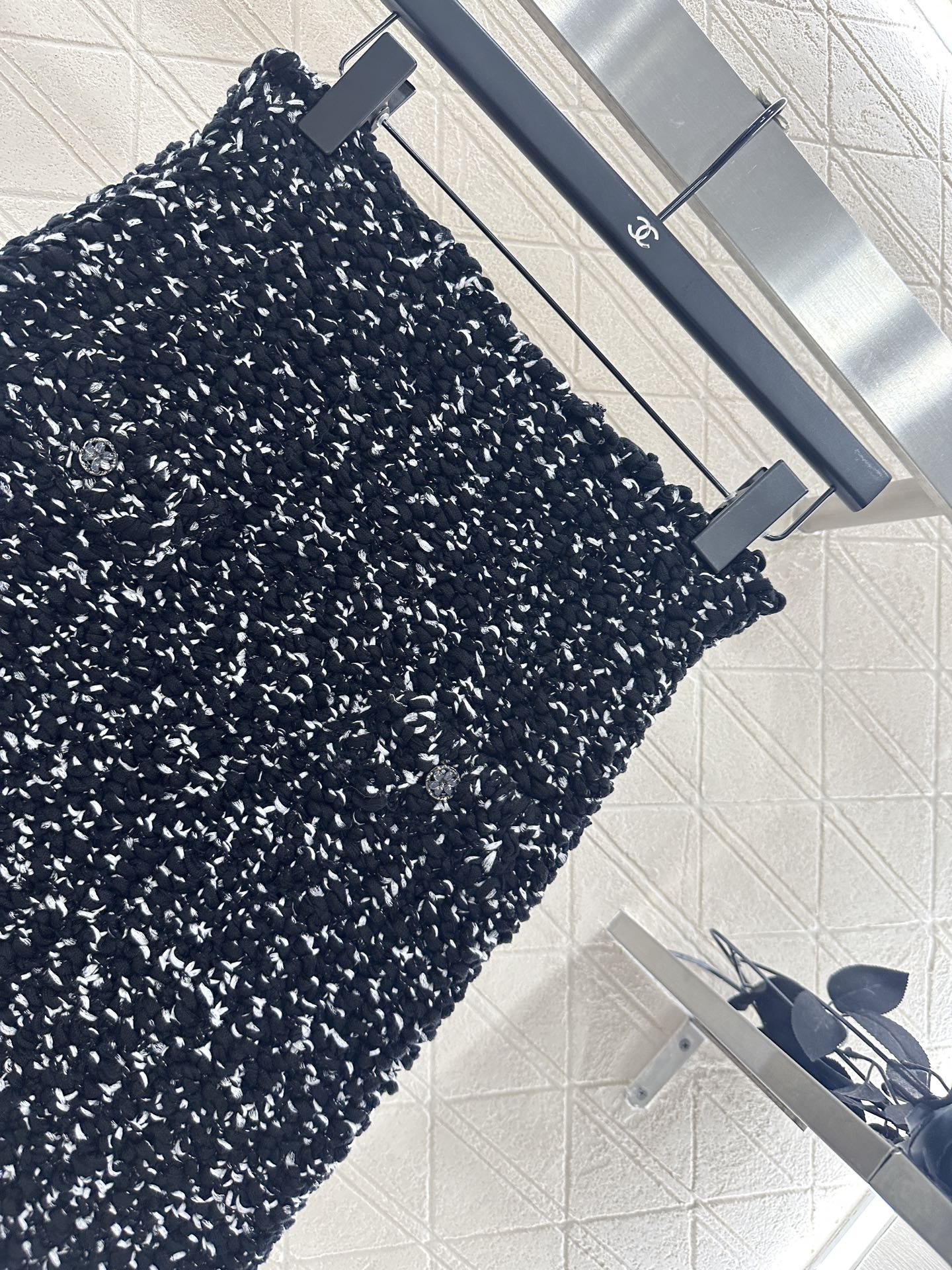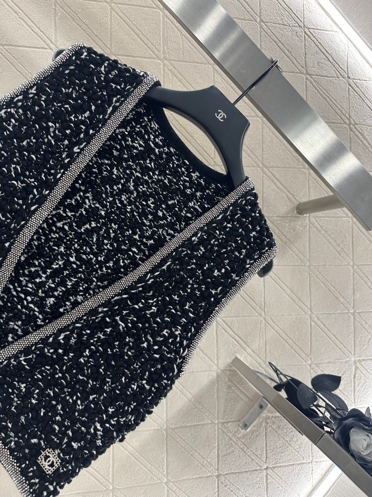 Cotton yarn weaving, comfortable to wear, soft and delicate. Round neck vest paired with half skirt set, embellished with rhinestone binding edges ➕ The hem features a double C logo placket design, showcasing the brand's tone with double splendor. The finished garment is woven with a dense texture and crochet, with solid colors combined with wavy hair particles. The black and white contrasting colors are durable and gentle. Paired with a hip hugging straight tube short skirt of the same series, it accommodates the body shape and improves the proportion. The water diamond edge of the skirt echoes, showcasing a retro style temperament and adding an elegant touch to the upper body. The exquisite and stylish feeling is fully displayed, suitable for both dating and commuting