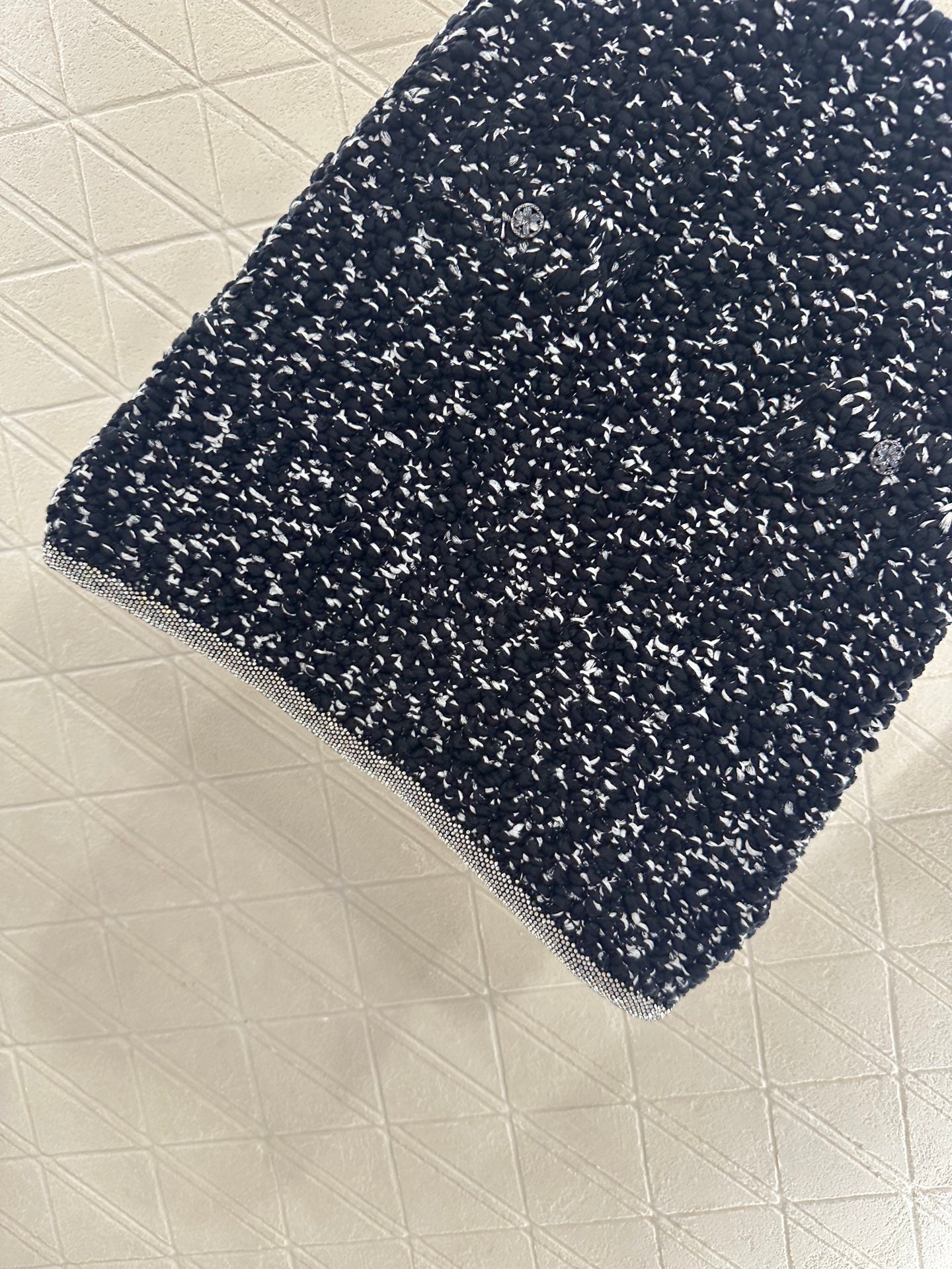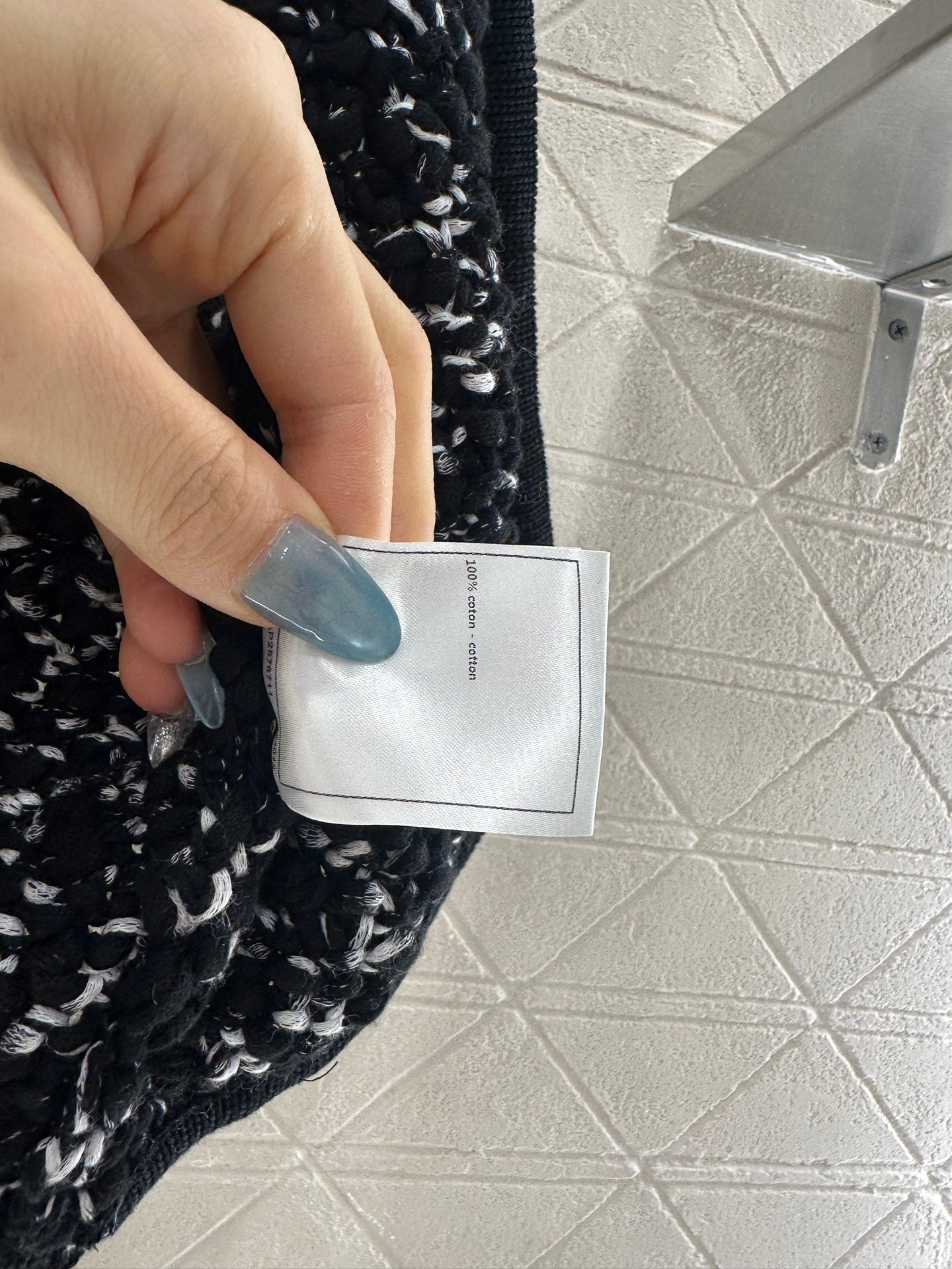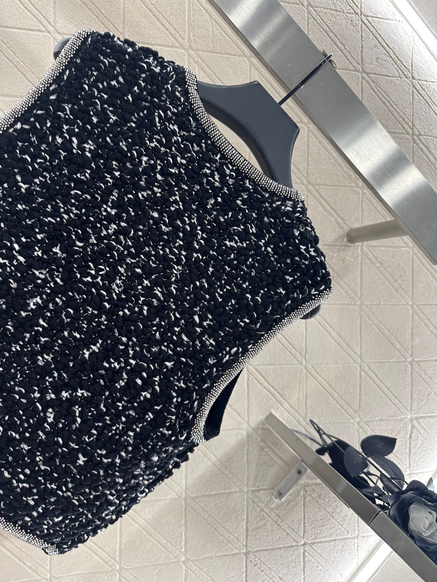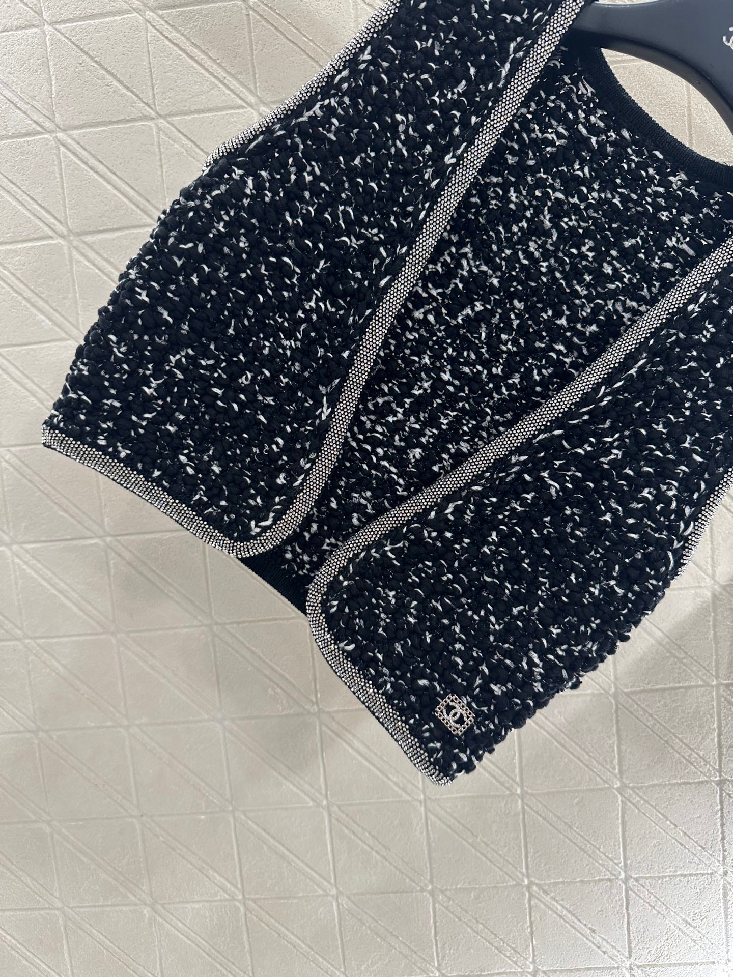 Cotton yarn weaving, comfortable to wear, soft and delicate. Round neck vest paired with half skirt set, embellished with rhinestone binding edges ➕ The hem features a double C logo placket design, showcasing the brand's tone with double splendor. The finished garment is woven with a dense texture and crochet, with solid colors combined with wavy hair particles. The black and white contrasting colors are durable and gentle. Paired with a hip hugging straight tube short skirt of the same series, it accommodates the body shape and improves the proportion. The water diamond edge of the skirt echoes, showcasing a retro style temperament and adding an elegant touch to the upper body. The exquisite and stylish feeling is fully displayed, suitable for both dating and commuting