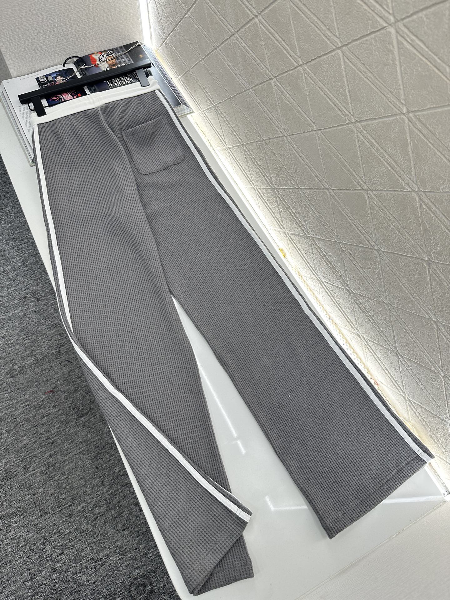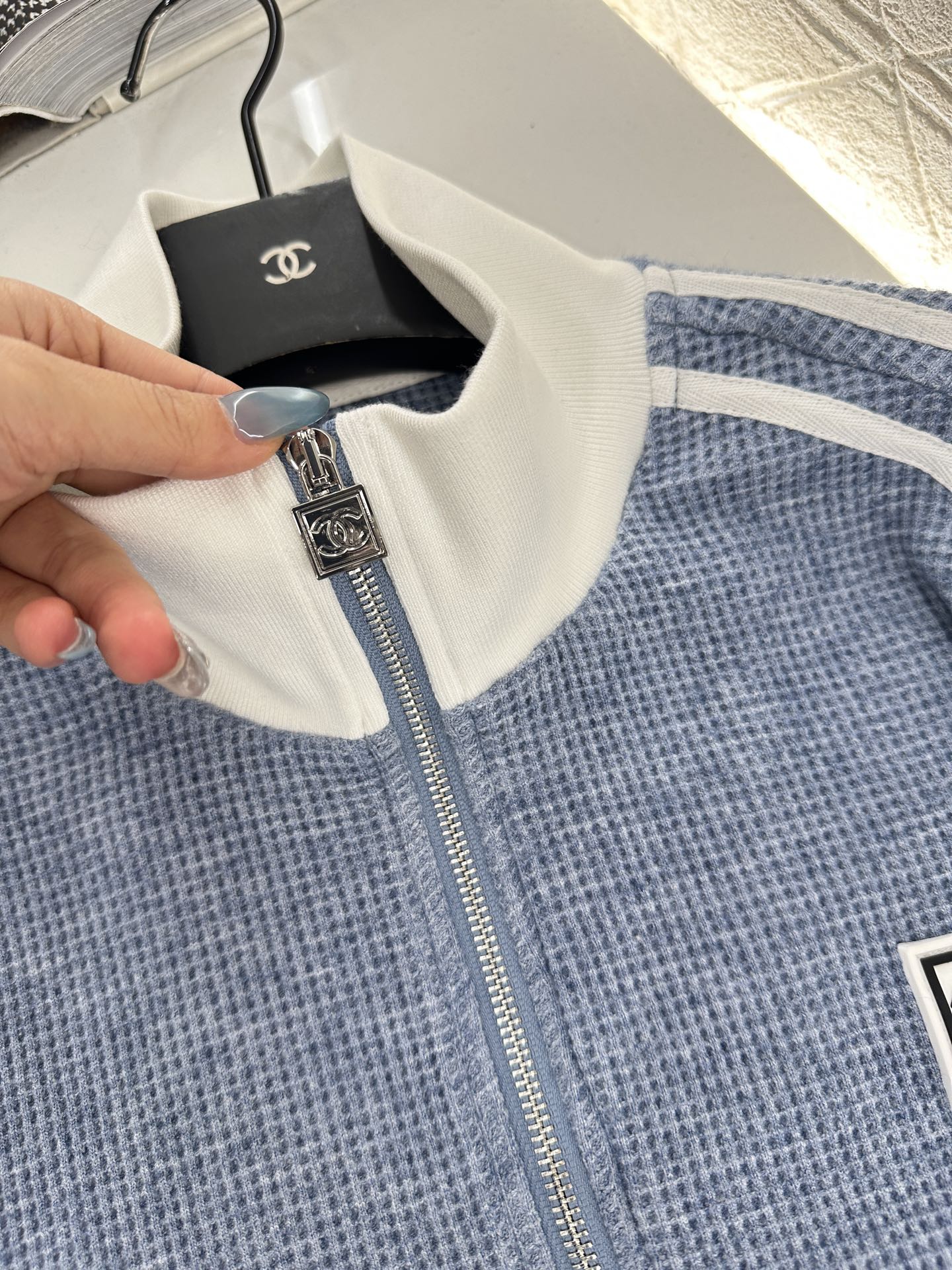 Delicate texture, comfortable drape, stand up collar jacket and long pants set, with striped webbing on the outer sides of the shoulders to easily outline loose lines, and zipper adjustment for easy on and off. Double C logo on chest ➕ The contrasting thread edging enhances the contour, complemented by the large body waffle texture decoration, with perfect attention to detail, showcasing the brand's tone. Paired with drawstring wide leg straight leg pants of the same series, with outer webbing on the legs ➕ The logo style is more unified and coordinated, meeting various daily dating needs and presenting a casual and free dressing style