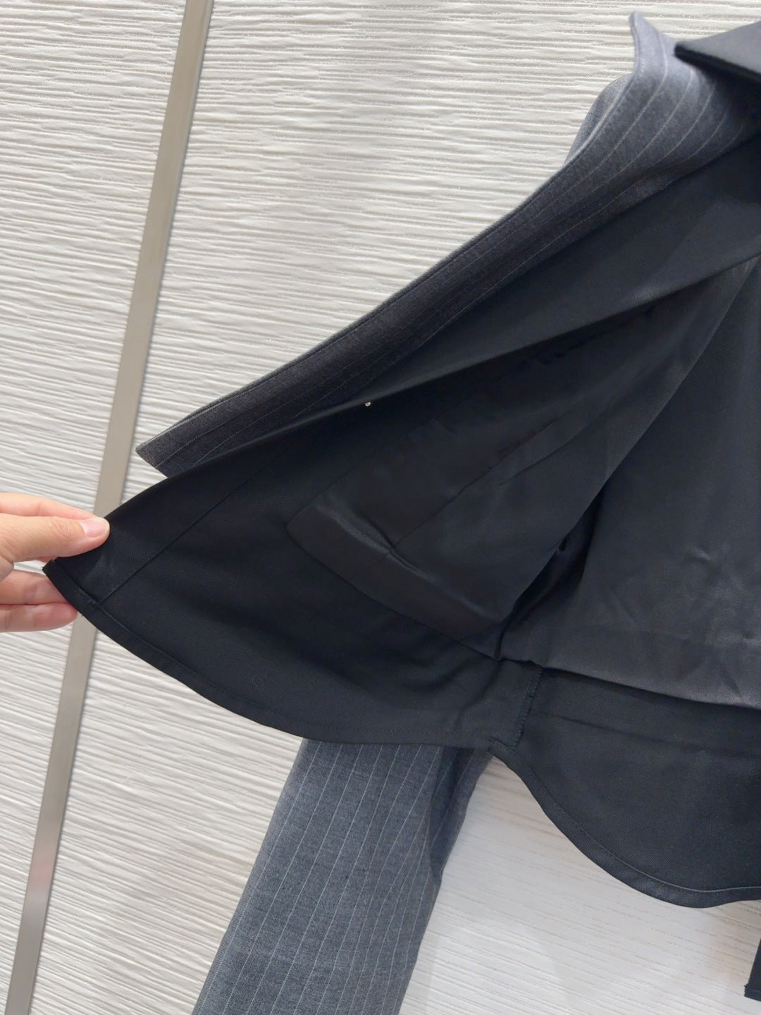 Front shoulder lapel fake two piece suit ➕ Wide leg pants set made of thin striped interwoven fabric, with a gun collar and a black shirt with double row engraved letters on the inside. The round button details highlight the luxurious brand design, simple and atmospheric. The short version is clean and free spirited, adding design highlights. The high-end and stylish body is decorated to create a sense of atmospheric lines. Paired with the same series of wide leg pants, the vertical striped texture elongates the leg direction, adding a noble and elegant atmosphere to commuting and attending important occasions