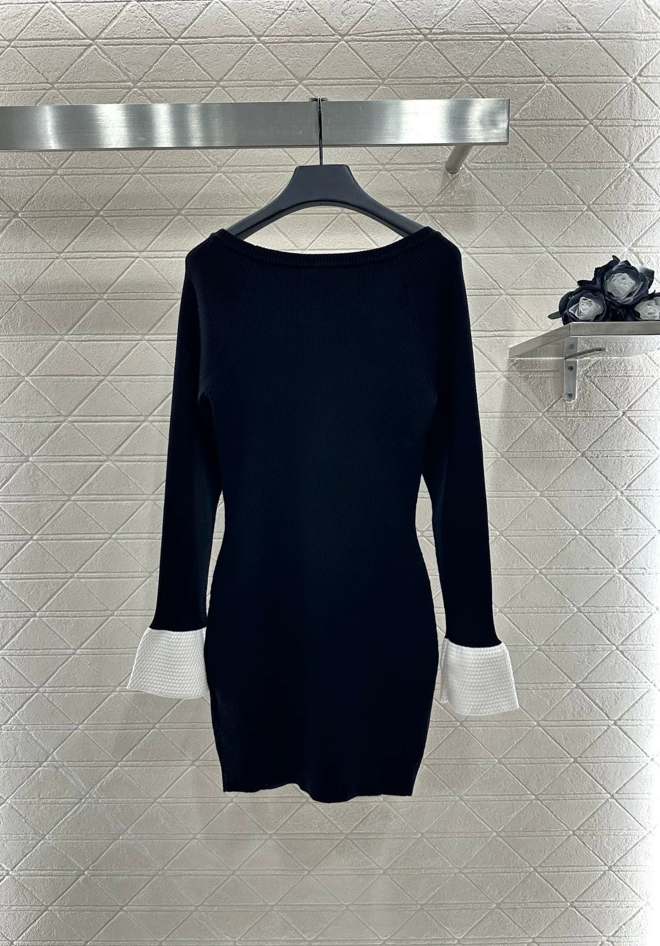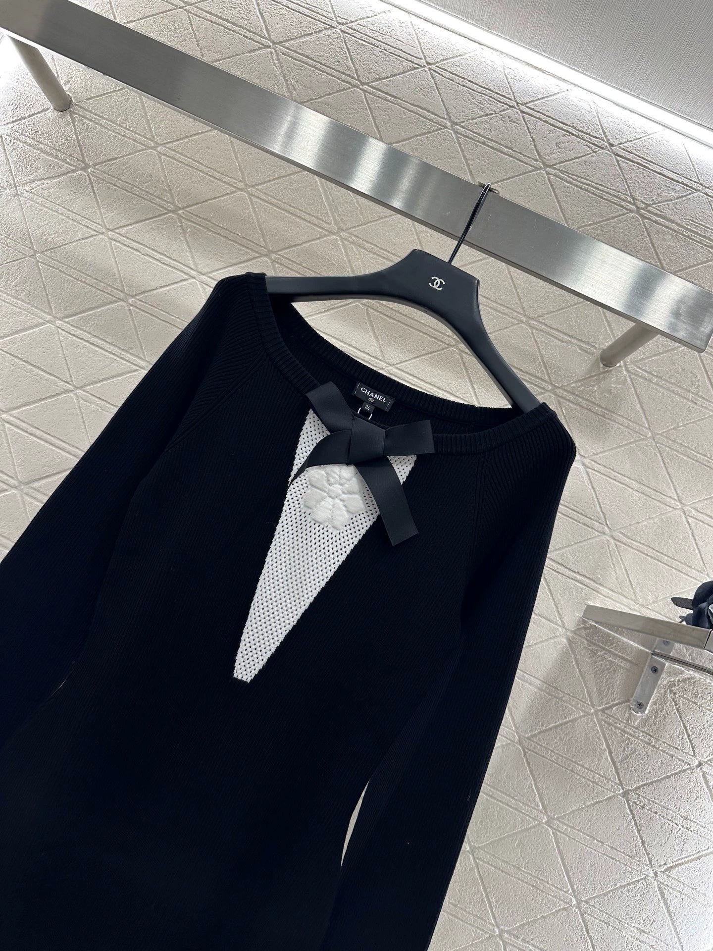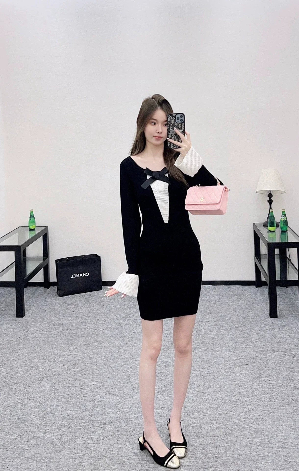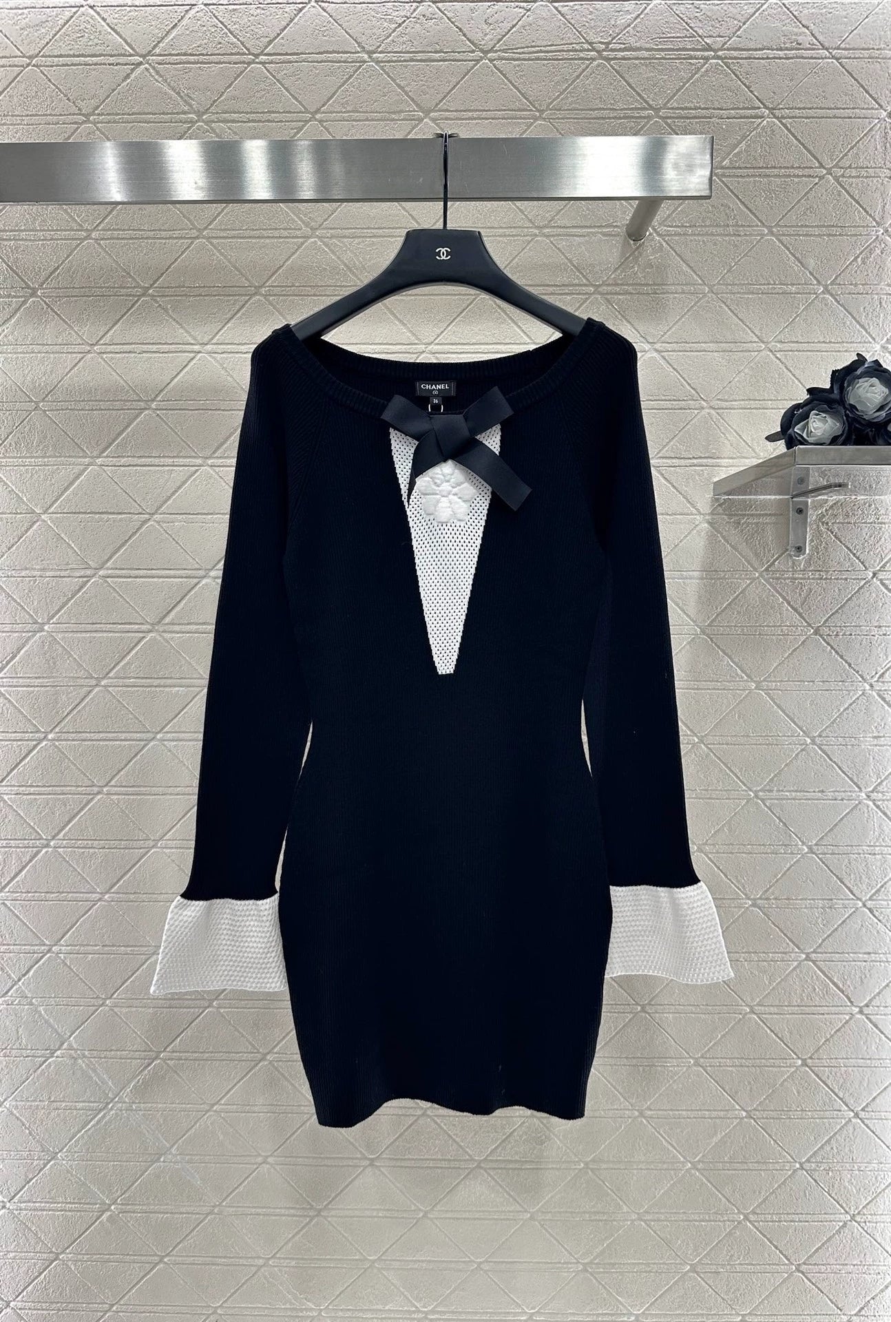Yarn weaving, comfortable and soft, full of elasticity, round neck flared sleeve knitted dress cut, V-neck white hollow contour ➕ Three dimensional bow camellia decoration, with a large black body that creates a collision, highlighting the taste of the fragrant family, elegant and generous. The three-dimensional cutting of the waist highlights the beauty of women's curves, adding an elegant atmosphere to simple dressing, making it slim and fashionable. It can be worn alone or layered all year round