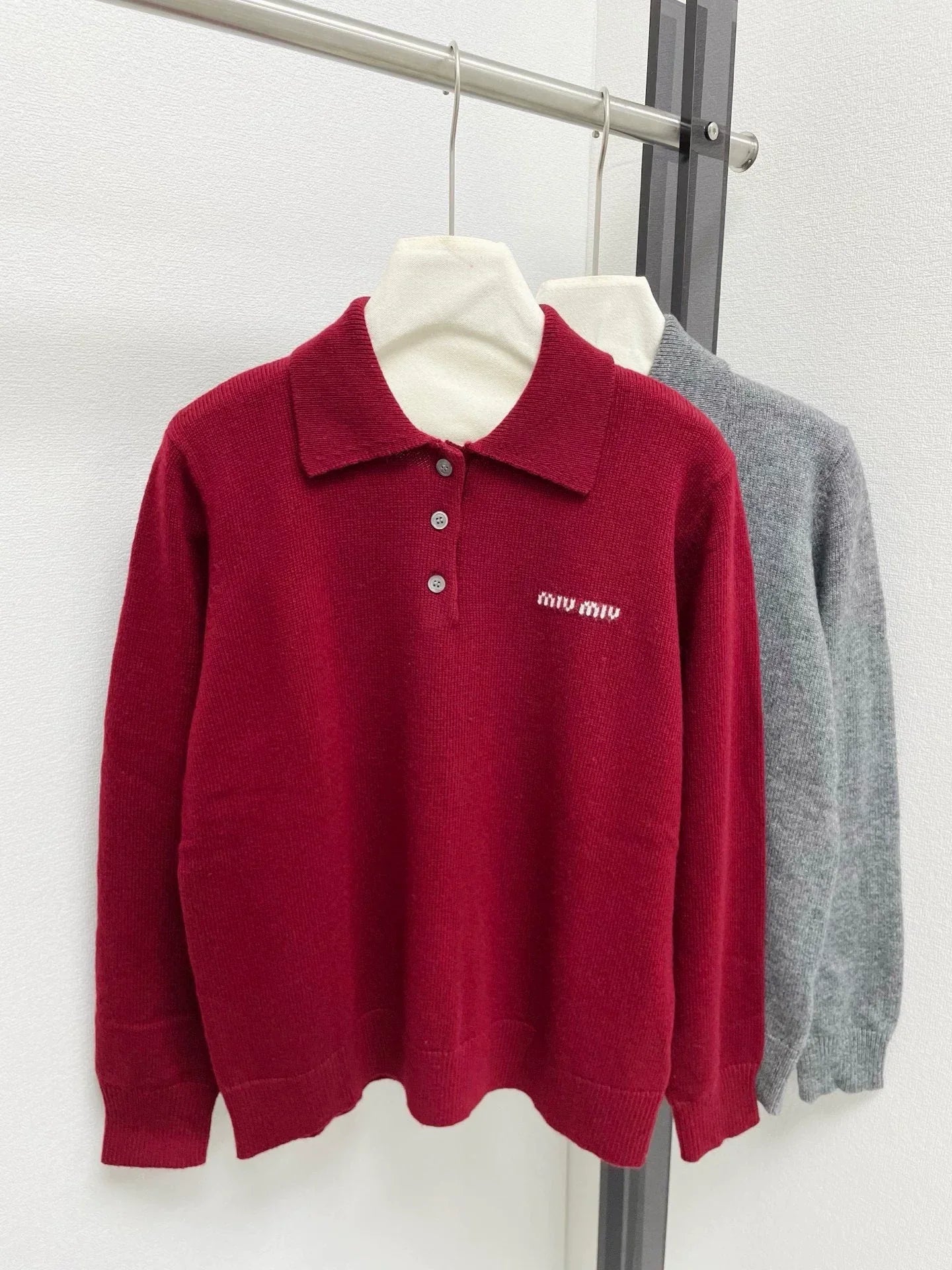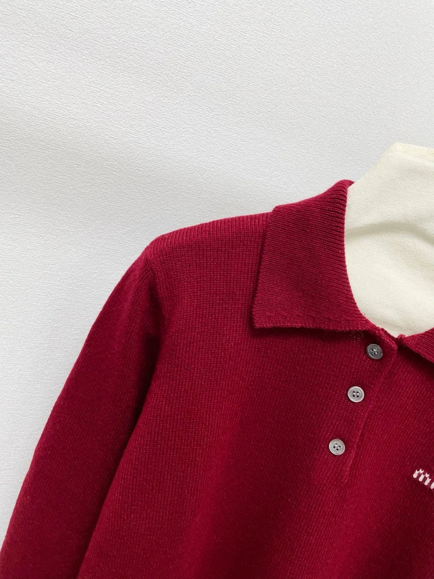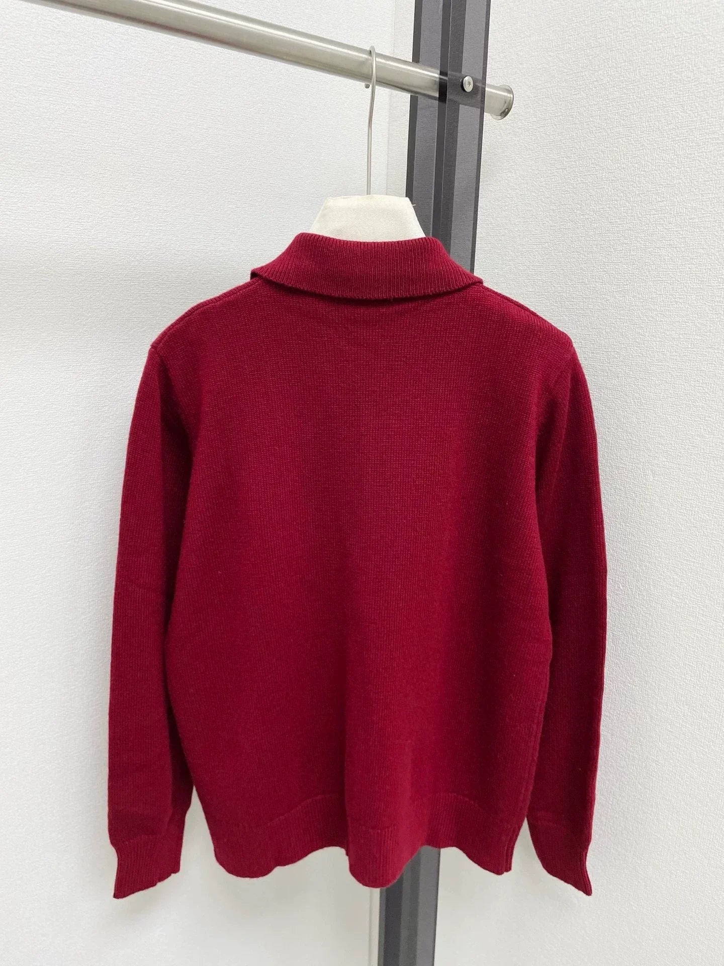 New autumn and winter polo collar knitted long sleeved shirt with exquisite letter embroidery embellishment on the chest, classic wine red color, simple and atmospheric