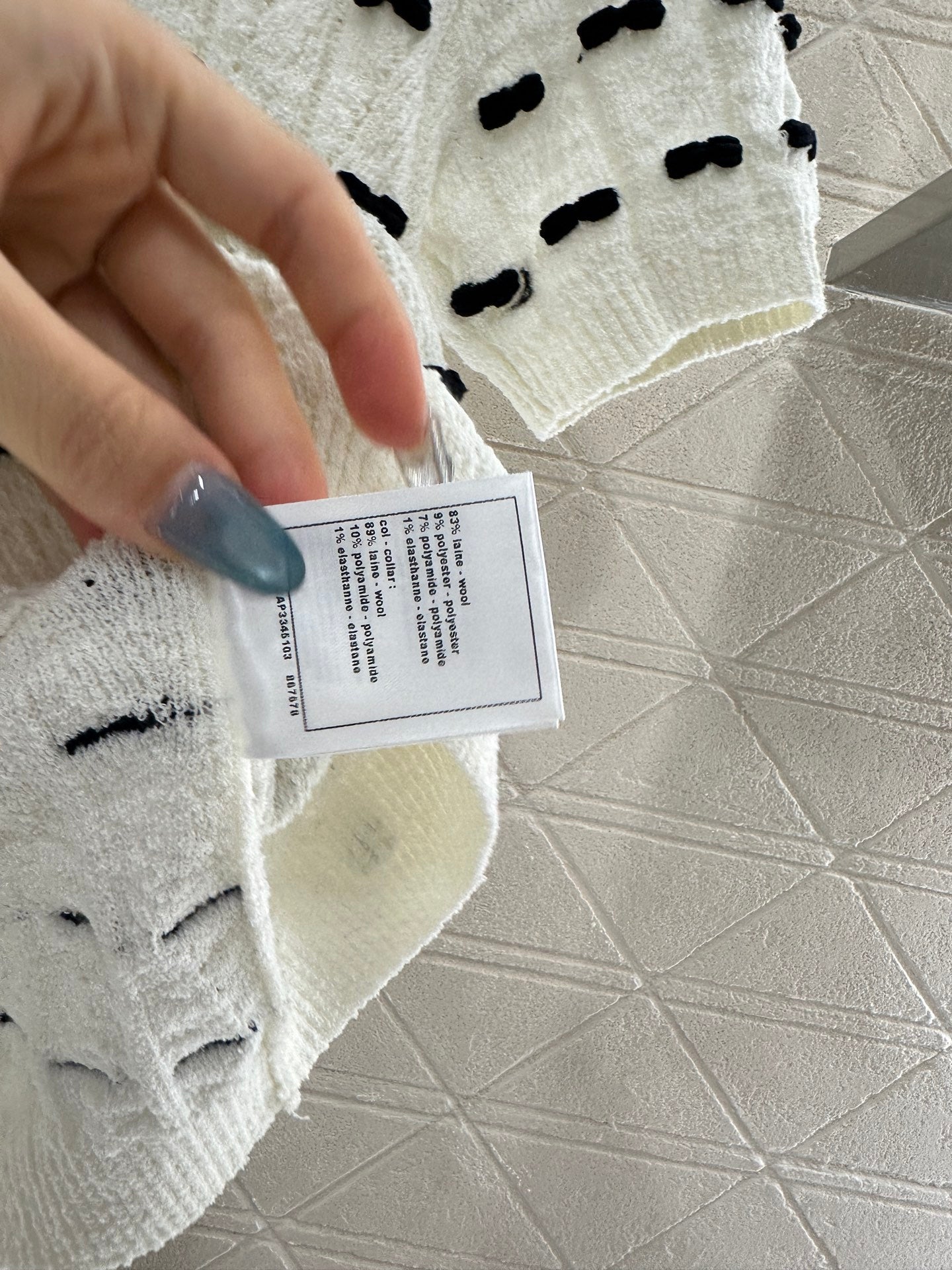 Weaved with wool yarn, the texture is high-end and comfortable. The short sleeved cut is knitted with a pullover, and the entire body is horizontally interwoven with contrasting black and white weaving threads, creating a visual effect of butterfly knots. The hem is decorated with rhinestone letters and double C patterns, creating a collision of gorgeous and dazzling styles, highlighting the brand's personality and high-end sense of dressing. Simple styles can be worn with exquisite personality, showing a relaxed and fashionable temperament. It can be worn alone or stacked, and is the first choice for autumn and winter fashion dressing.