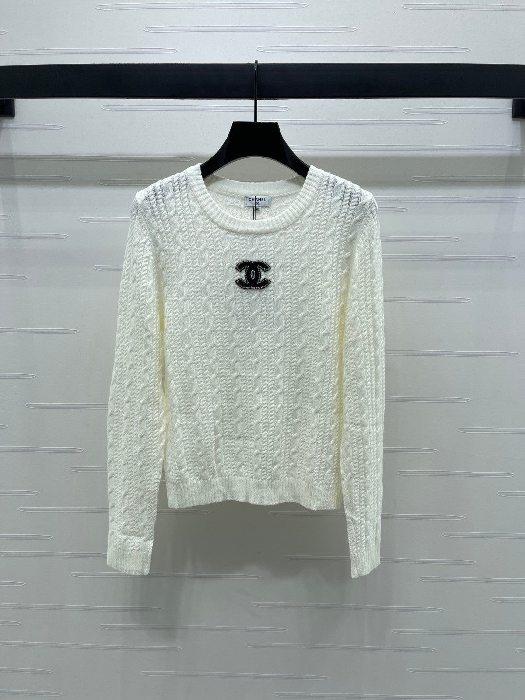 Breathable and comfortable round neck long sleeved top with crochet texture interwoven throughout the body, outlining a twisted floral pattern to highlight the high-end feel of the outfit. The elastic elasticity is even more exquisite, making the outfit look slimmer. The body is inclusive, showing a relaxed tone. The double C logo on the chest highlights the light luxury and fashionable temperament. It can be worn alone or in layers