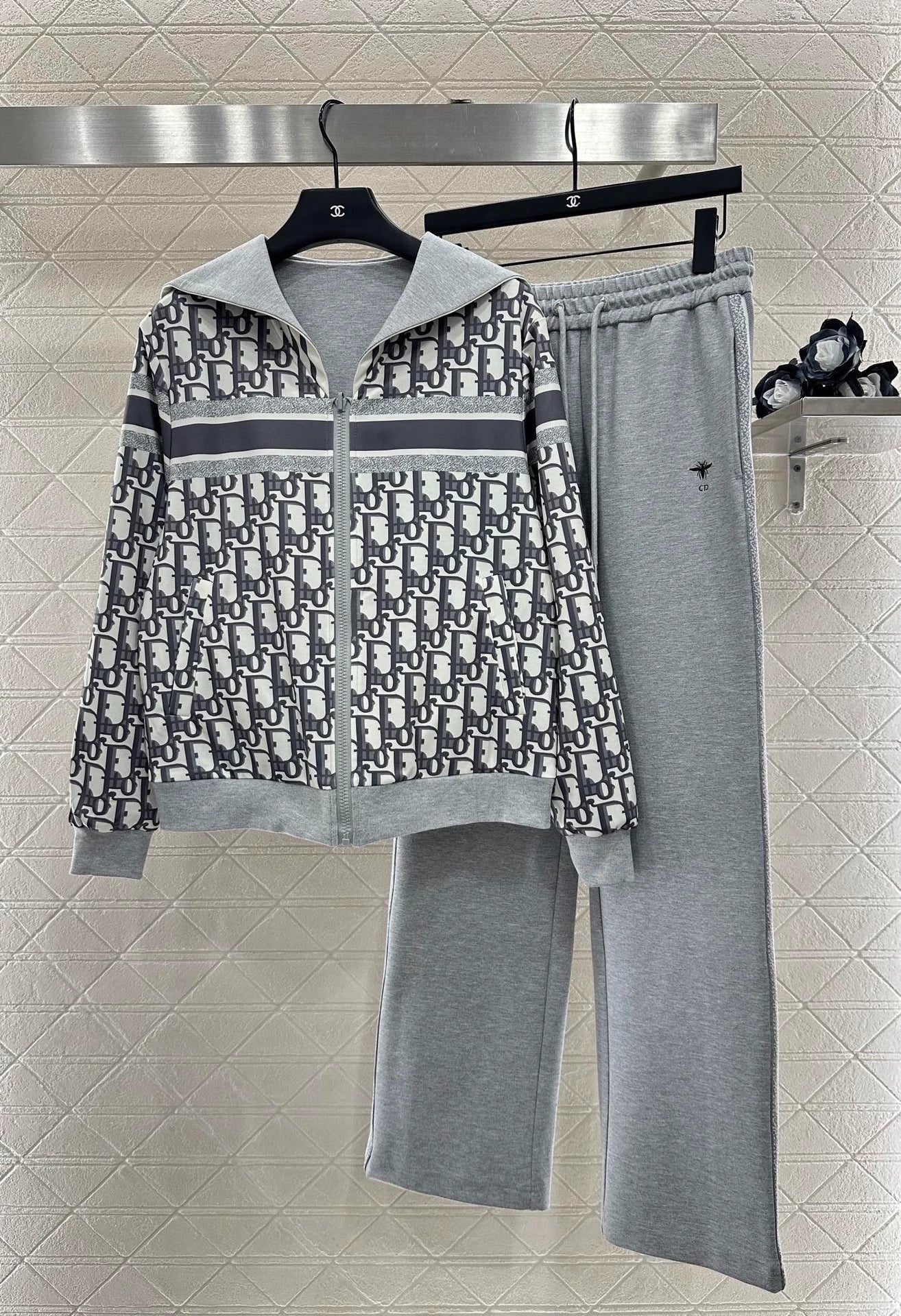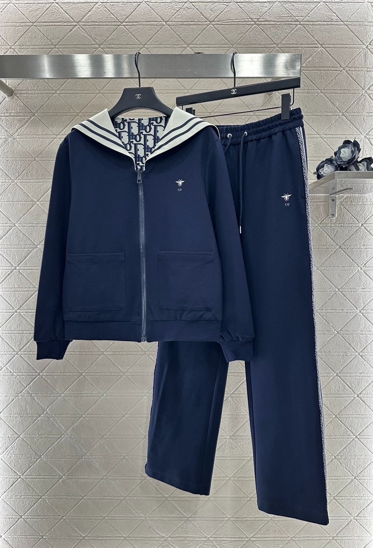 Texture Glossy Appearance High end Loose Hooded Drawstring Jacket with Zipper Open and Adjustable Casual Feel Full of One Side Solid Color with Bee CD Logo ➕ Navy style striped collar with a full layer of floral letters on the other side, exuding a strong sense of luxury and showcasing the brand's tone. Paired with pants from the same series, the side leg straps are woven with letter logos, highlighting the style
