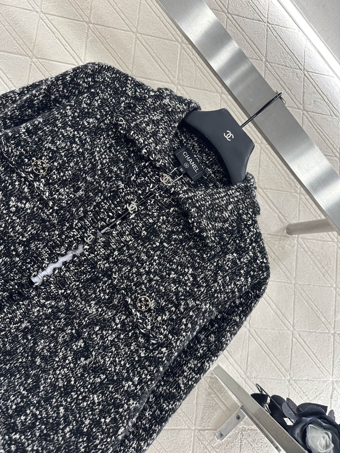 Comfortable to wear, soft and delicate. Knitted cardigan with a water diamond double C-button connection and a cardigan design. The collar edge extends to the front with wavy lace ➕ Embroidered crochet hooks and lace decorations on the hem and cuffs, combined with double C engraved buttons, showcase the brand's tone. The finished garment is delicate and dense in texture, crocheted in plain color, and paired with durable and gentle hair particles. It adds an elegant and refined style to the upper body, showcasing a refined and western-style feel. It is suitable for both dating and commuting