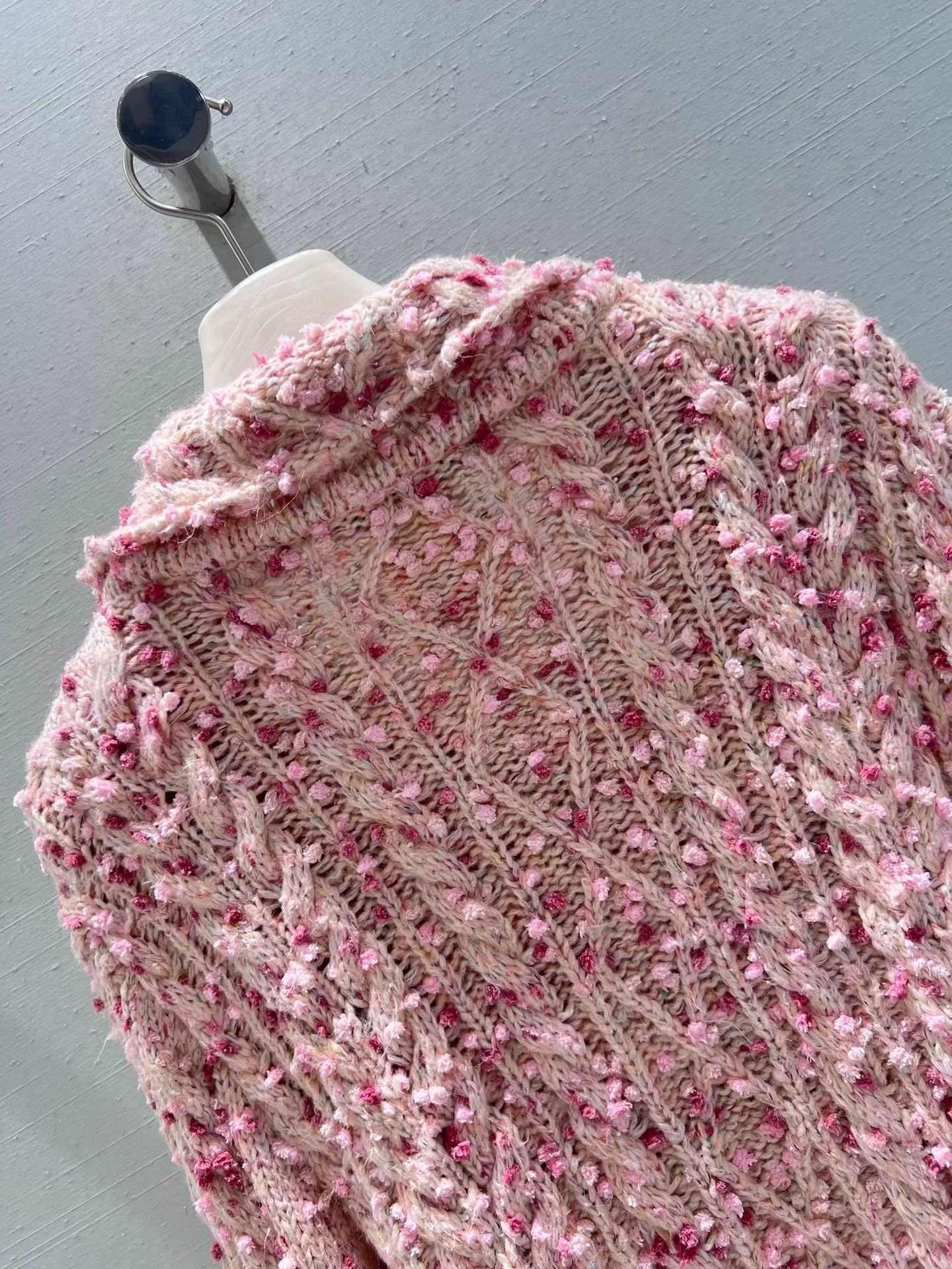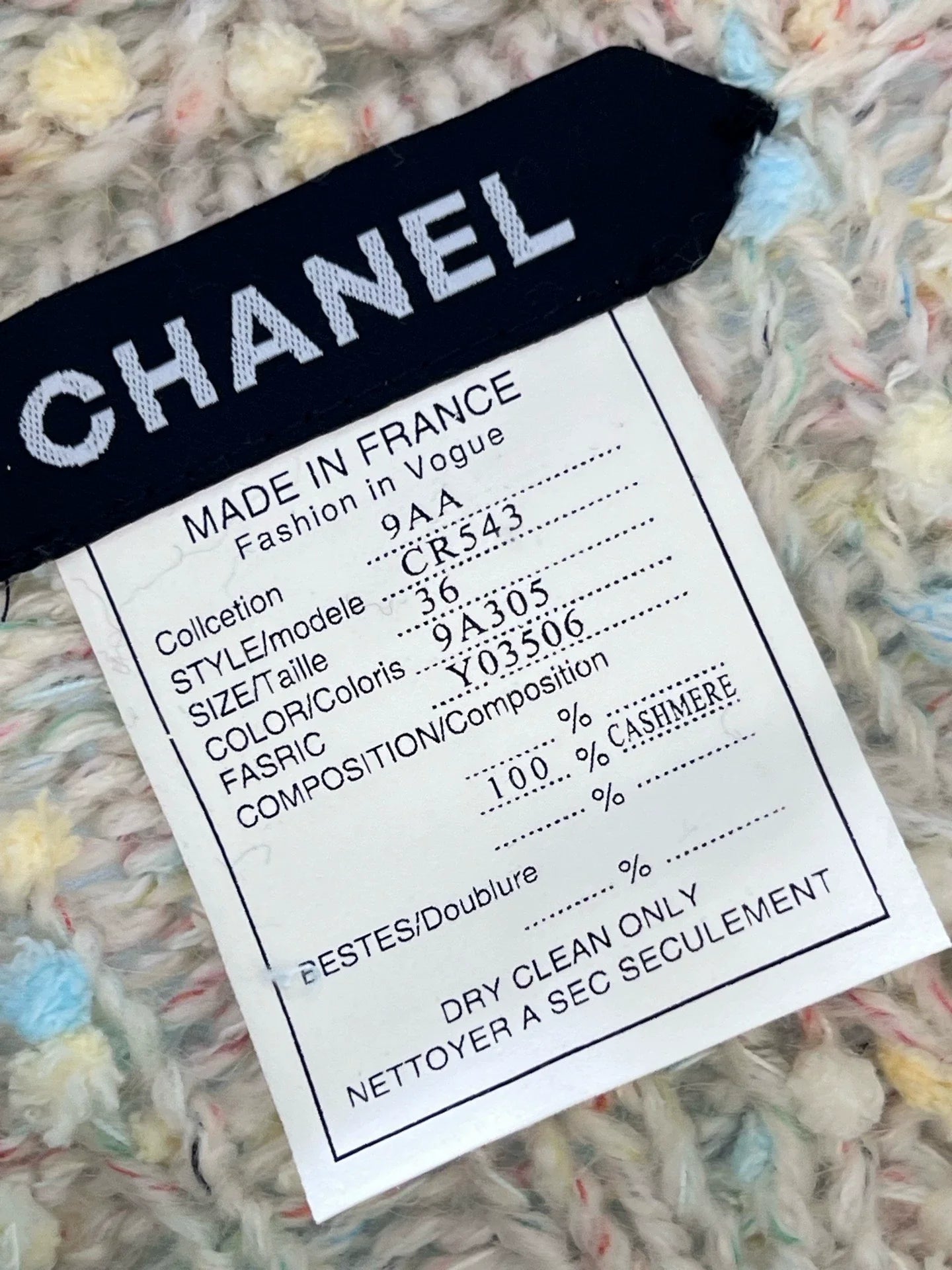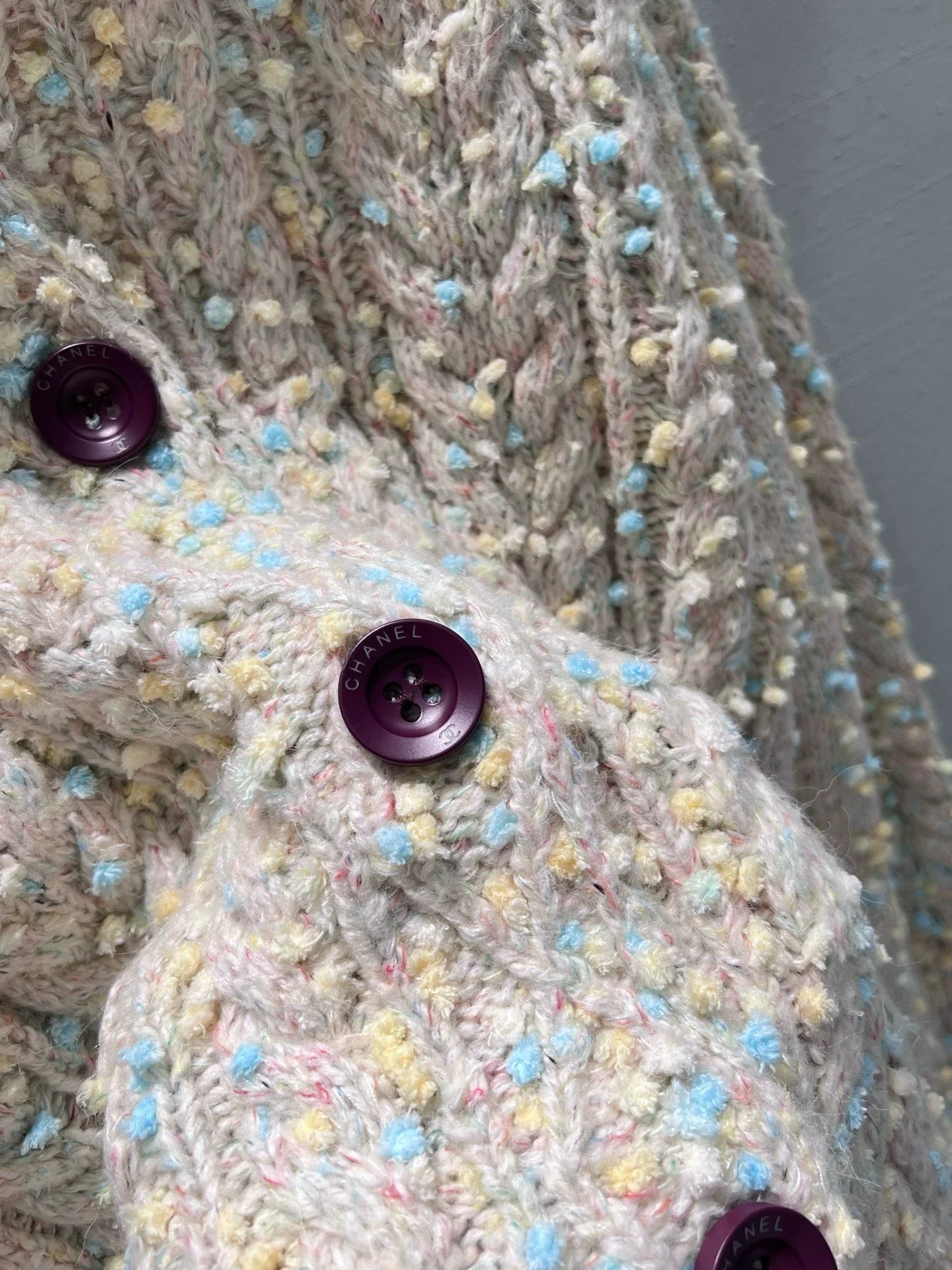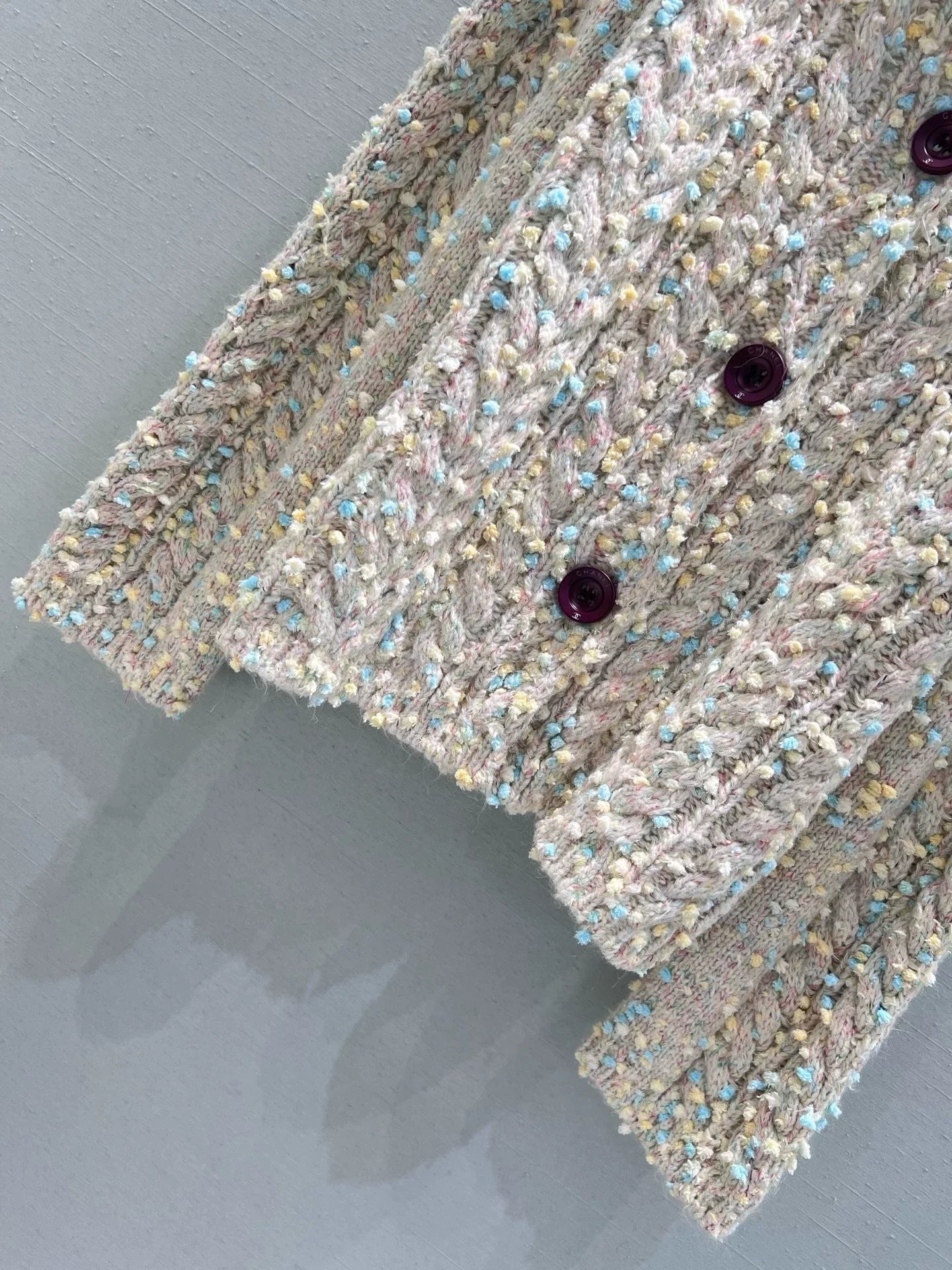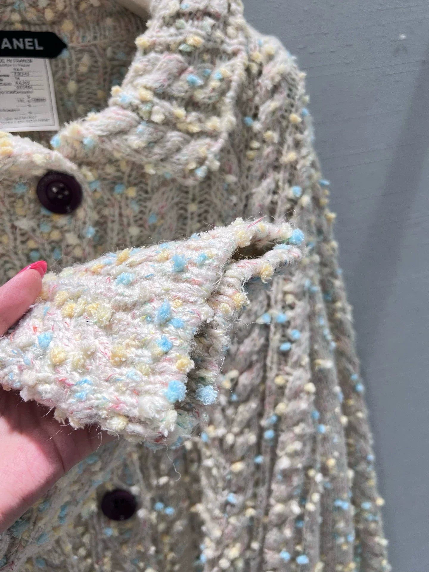 Exquisite craftsmanship makes the knitted texture dense and orderly, retaining the retro texture of coarse woolen fabric. By blending delicate coarse woolen fabric with yarn and using the twisting weaving technique, a rich and layered texture is presented, as if capturing the splendor of a spring garden on the garment body; The classic lapel design is paired with CC buttons, and every detail continues Chanel's luxurious style.
