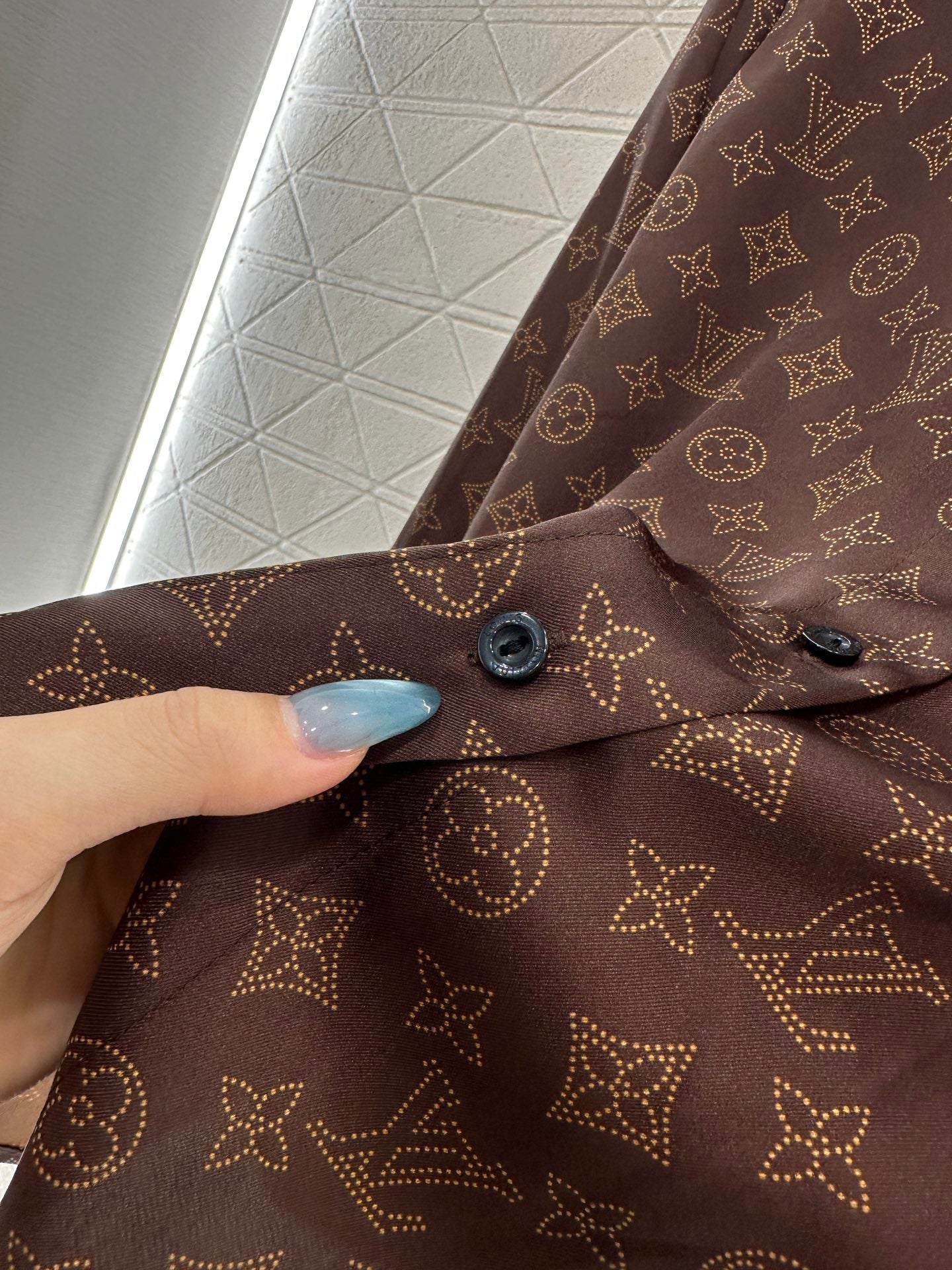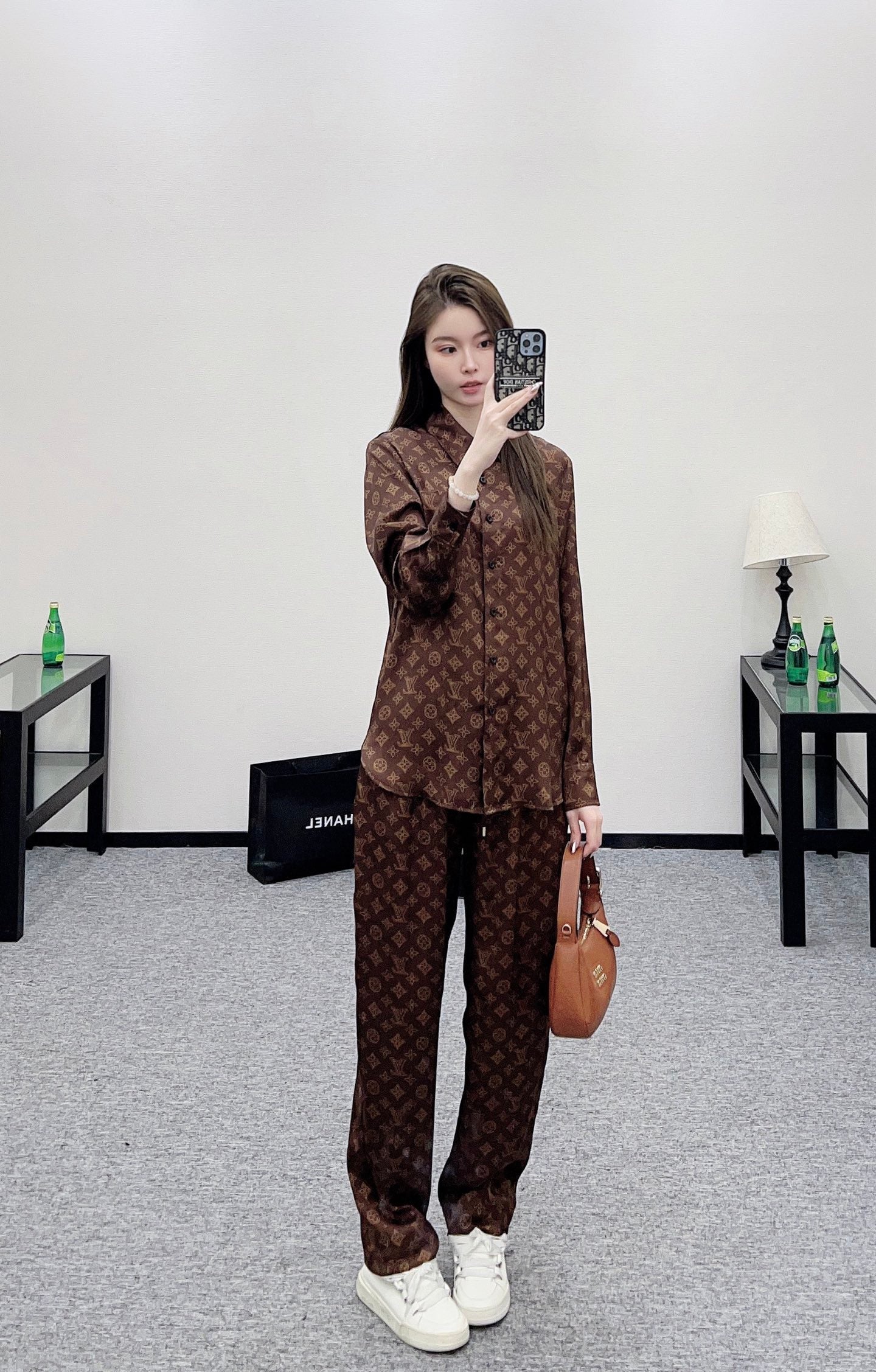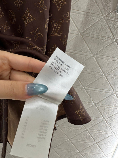 Thick twill material, skin friendly and comfortable, not easy to stretch, iconic brand brown with full printed four leaf clover letter logo pattern, relaxed and fashionable, full of socialite and old money feeling. Long sleeved shirt top looks slim and versatile, paired with the same series of elastic pants, the upper body is lazy and exquisite, suitable for both home and outdoor wear 👌。