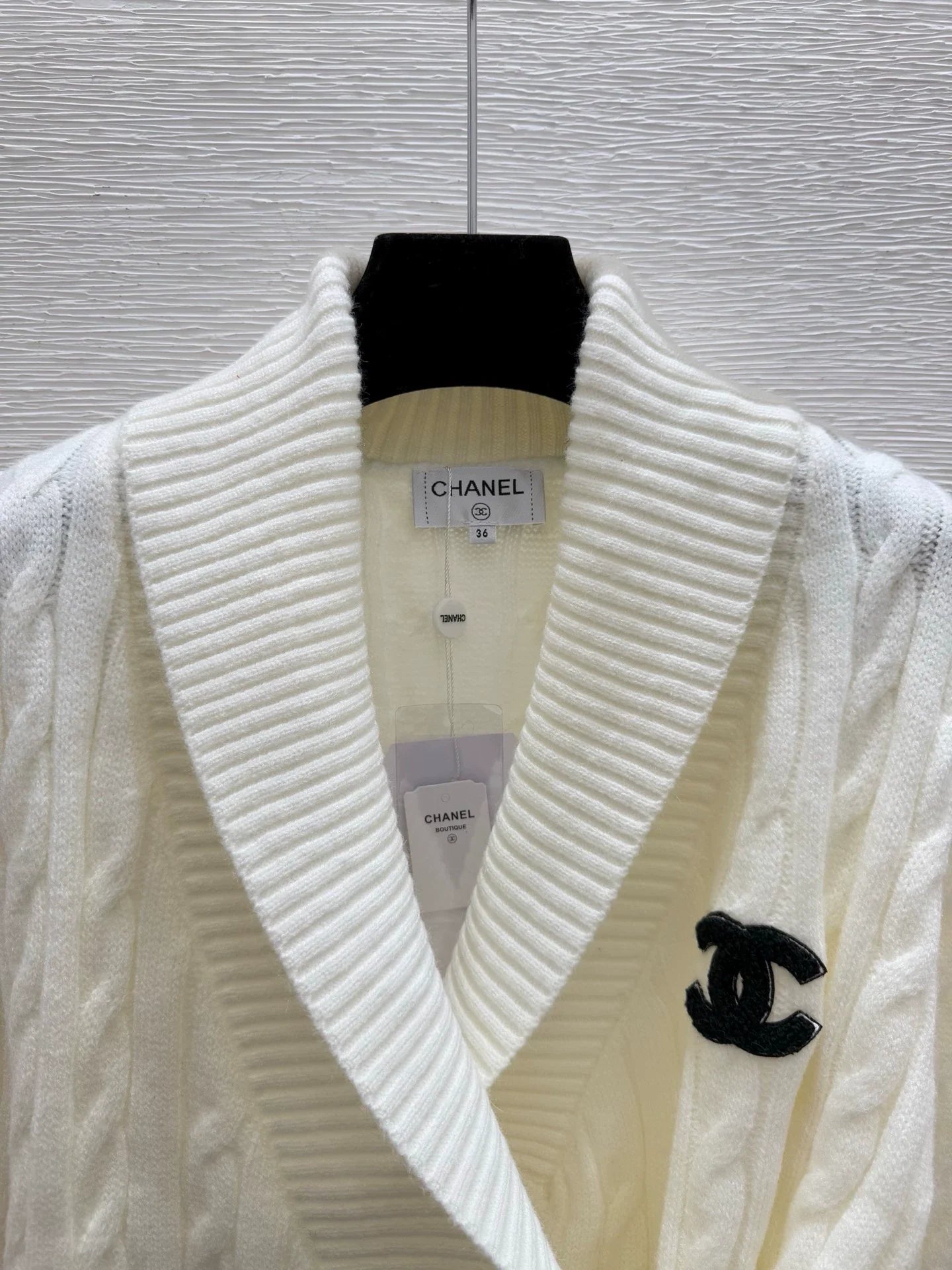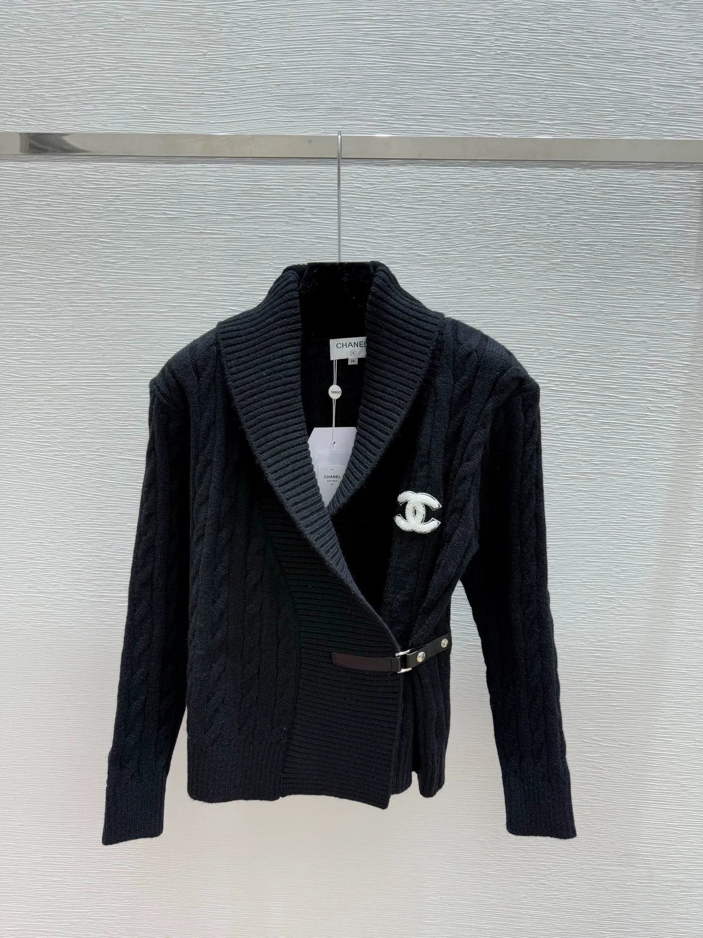 The fabric is made of 75% wool, 10% silk, and 15% nylon, which is soft and comfortable. The classic Fried Dough Twists knitting process is matched with the waist buckle design. The black version matches the white double C logo, and the white version matches the black double C logo, which is simple and elegant.
