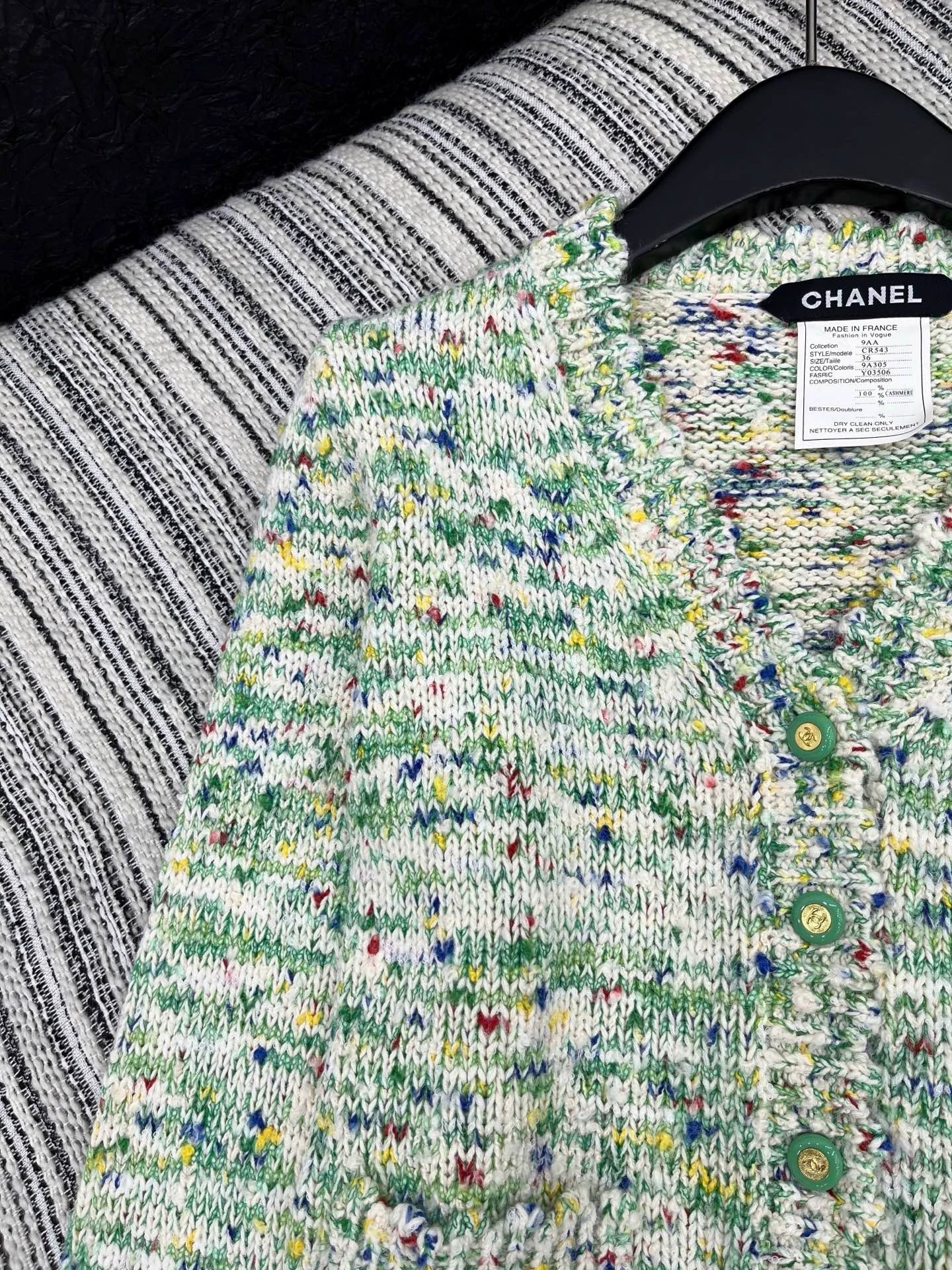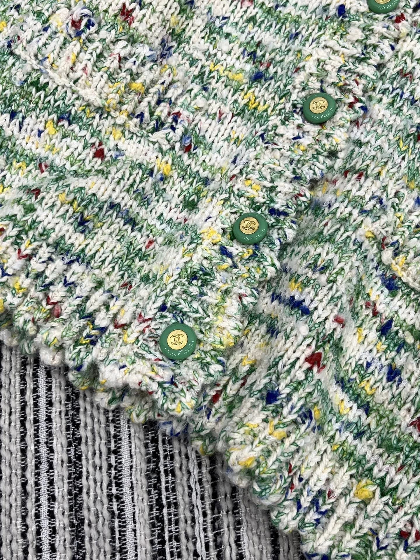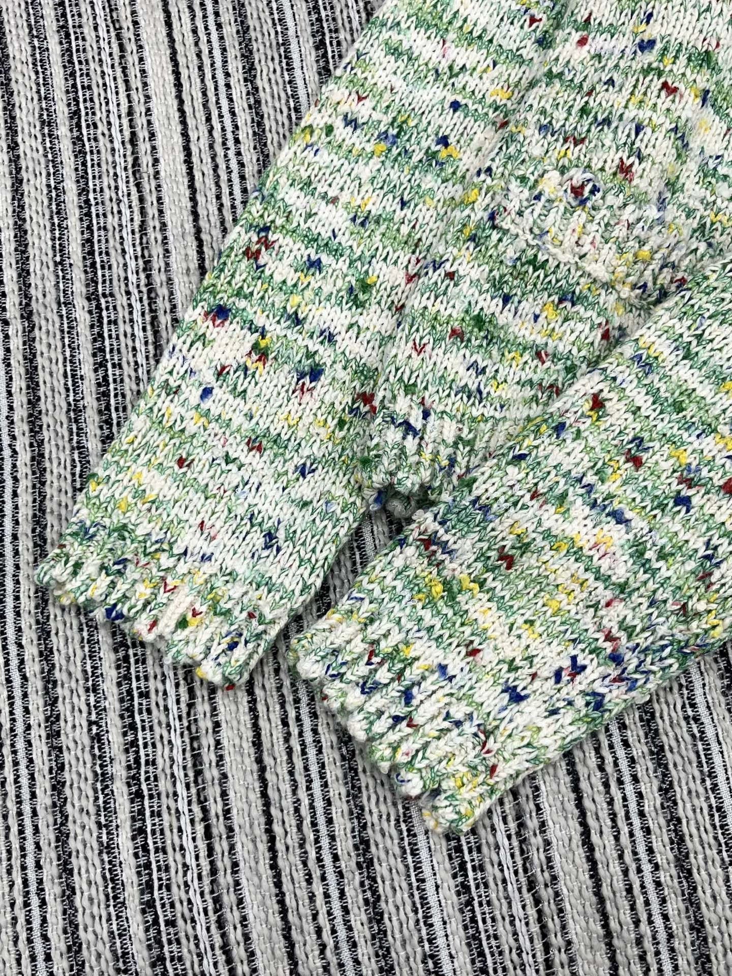 Using high-quality cashmere fabric, exquisite floral weaving technology, and colorful blended yarn. Soft, comfortable and breathable, with a slim and stylish design. V-neck design, long sleeved style, embellished with green buttons, exquisite details