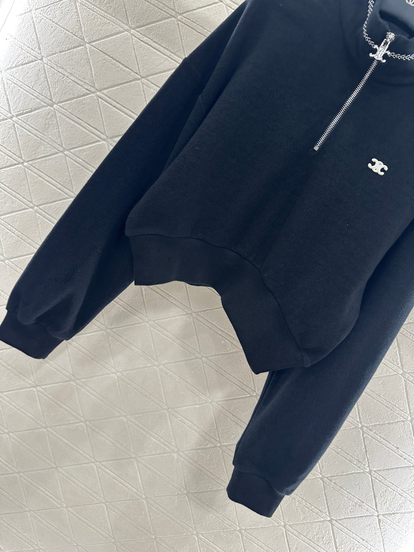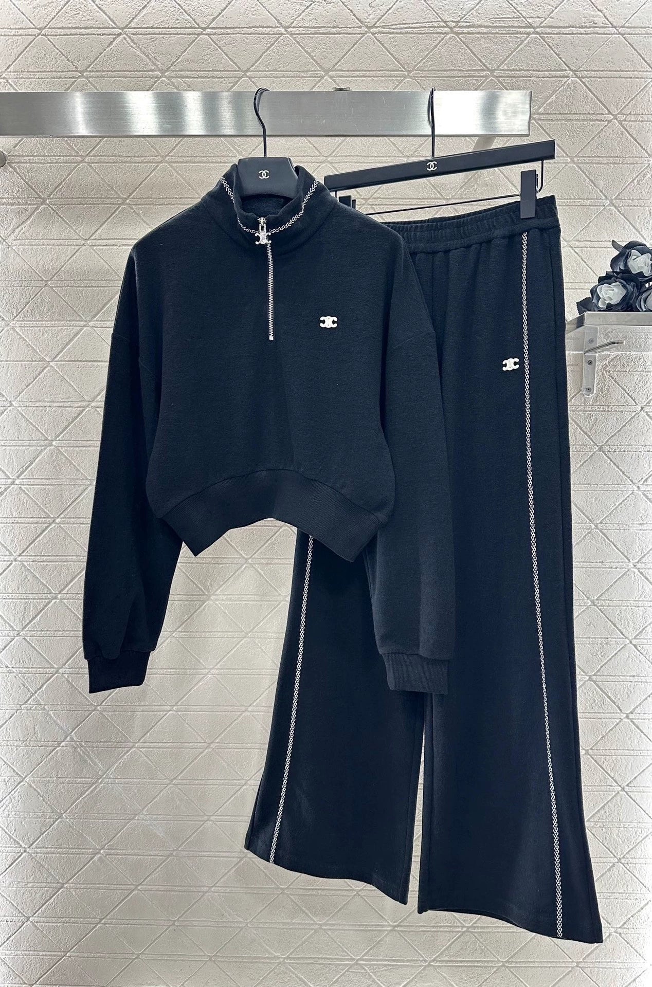 The twill cotton material is comfortable, breathable, and stylish. The high rise collar zipper pullover sweatshirt is cut in a fashionable and casual style. The iconic Arc de Triomphe logo is embellished on the chest, instantly enhancing the brand's style. It has a strong sense of old money and rich visual effects, making it more fashionable. The short loose fit adds vitality to the slimming effect. Paired with straight leg pants of the same series, the lace decoration on the side of the pants legs creates a more personalized and casual look, adding a sense of style. The complete set is simple and high-end, essential for daily outfits, a guide for casual wear, relaxed and fashionable.