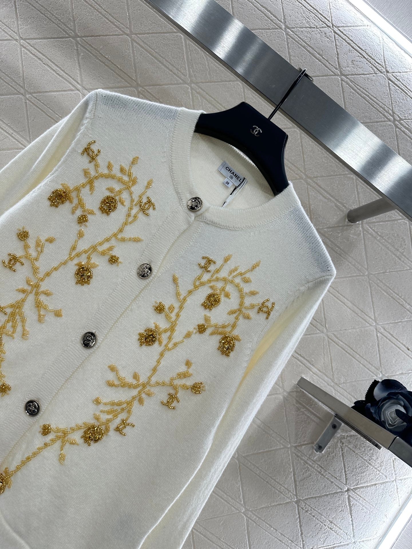 Cashmere yarn weaving, density fine needle weaving, clear woolen texture, comfortable and skin friendly, round neck shoulder button cardigan cut, heavy nail beads distributed on both sides of the front of the body, combined into flower branches, leaves, plant vines artistic patterns, completed with fine sequin embroidery technology, reflecting gorgeous light, wearing a gorgeous and relaxed feeling, leader mouth hem thread closure, full of elasticity, rich color matching design hierarchy, body shape inclusive, wearing age reducing fashionable