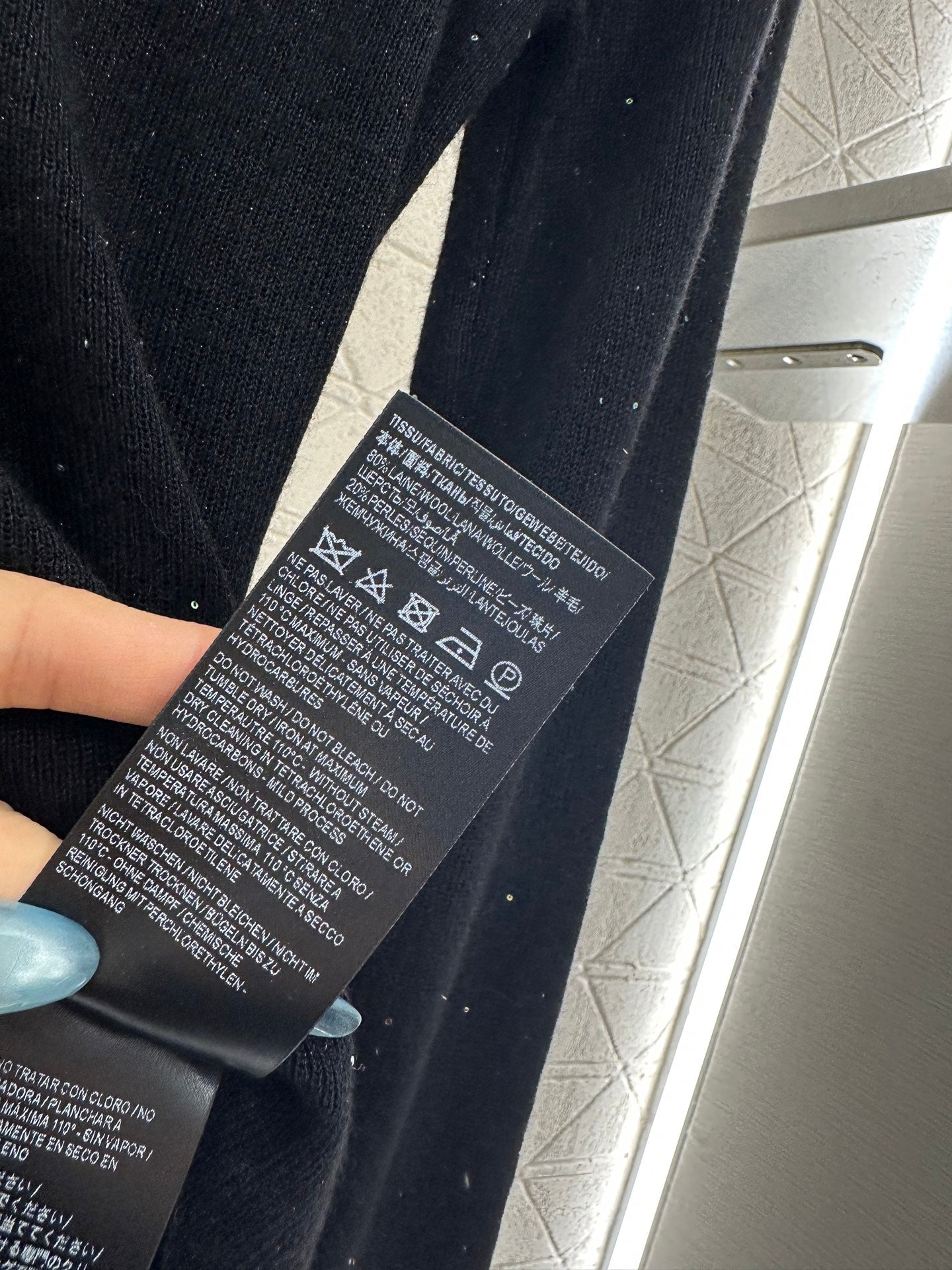 Tencel wool material is soft and delicate, with a comfortable texture. It is a high necked knitted base sweater with a solid color that is versatile and durable. The yarn fabric is embellished with fine glitter beads, breaking monotony. Combined with the chest letter logo brooch, it showcases the brand's tone and low-key texture. Elastic fabric, tailored to the body shape, exuding a simple and elegant temperament on the upper body, suitable for daily commuting 👌
