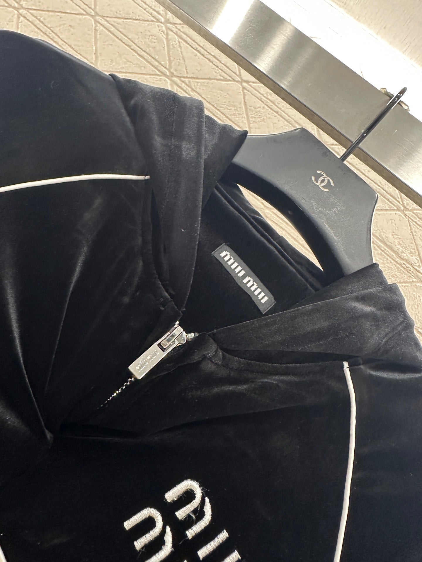 Velvet material, glossy texture, comfortable drape, hooded drawstring zipper jacket, handsome and full of fashionable style. The contour line is white with tied edges, and the letter logo is designed in a simple way to showcase the brand's style. When worn, it shows off its personality and style. Paired with the same series of drawstring wide leg straight leg pants, the outer webbing of the legs echoes, modifying the leg shape to appear thin and relaxed. The complete set of matching is more brand charming and fashionable.