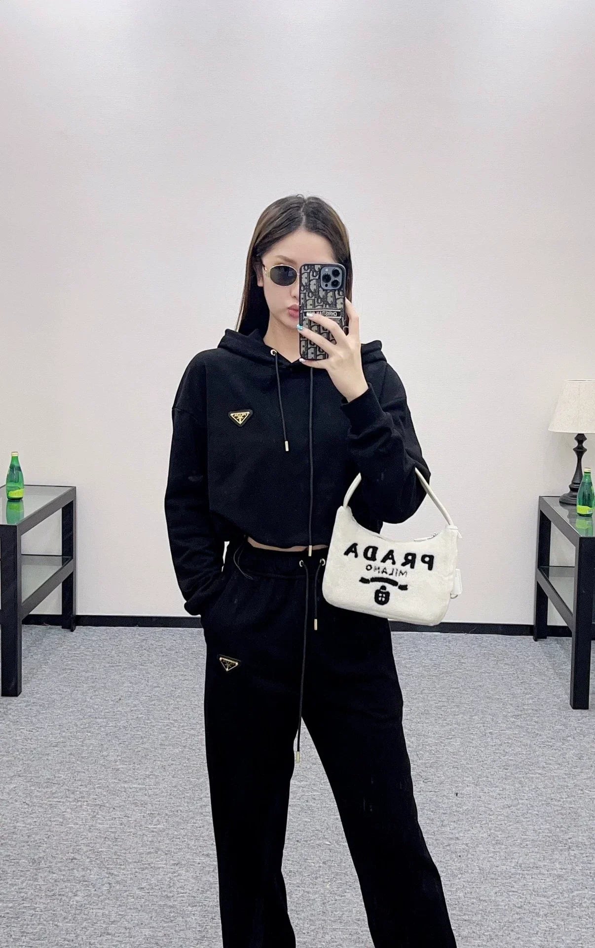 Diagonal cotton, all cotton material, soft cotton velvet surface, autumn and winter warm suit, comfortable and easy to wear, neat and stylish hooded short hoodie, long pants, casual suit, loose fit, with two waist side drawstrings for easy on and off, triangular metal brand letter logo on the chest for more style and personality, highlighting brand positioning, improving texture, drawstring tied foot pants, set for upper body wearing, worry free logo echoes the design sense, adding youthful vitality to the overall look