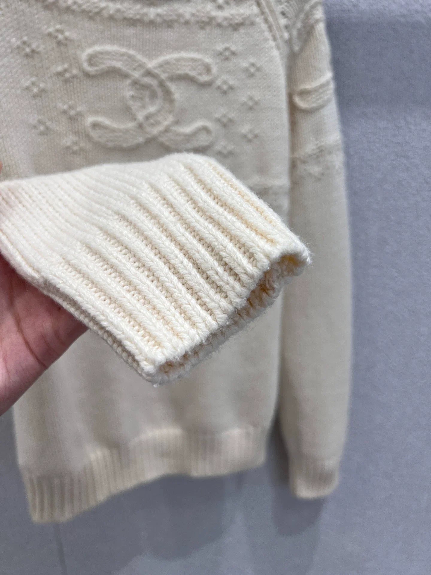 Exclusive high-end production! The iconic double C-hook flower is symmetrically presented on the front and back, carved with three-dimensional knitting technology, showcasing high precision craftsmanship in the details. It appears faintly during walking, and the classic round neck is compatible with various interior styles. It can be worn alone to highlight the knitted texture, or layered on shirts to create layers; Loose shoulder cut embellishes the shoulder line, friendly to various body shapes, lazy and casual without losing weight