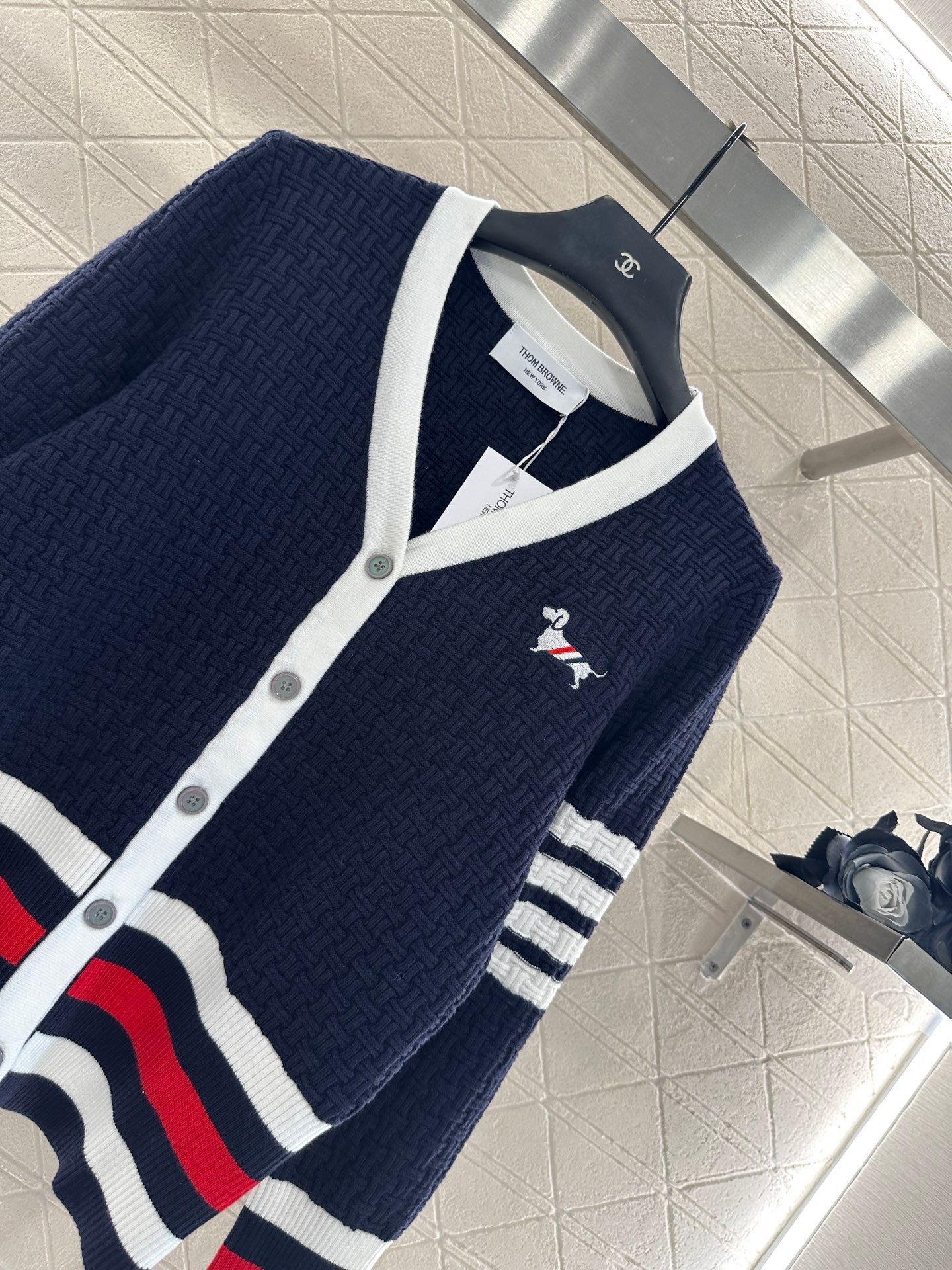 Woolen yarn weaving, with a glossy texture, soft and skin friendly, featuring a regular V-neck cardigan cut and a textured crochet hook that alternates horizontally and vertically, making it look slim yet fashionable. The collar extends to the front for contrasting color accents, while the cuffs and hem stripes complement the details. The elastic thread edging fits the body better, and the chest is decorated with embroidered sausage dog logos, showcasing a playful and youthful brand tone. The large body comes in two colors of light and dark, relaxed and lazy, making it the first choice for layering in autumn and winter.