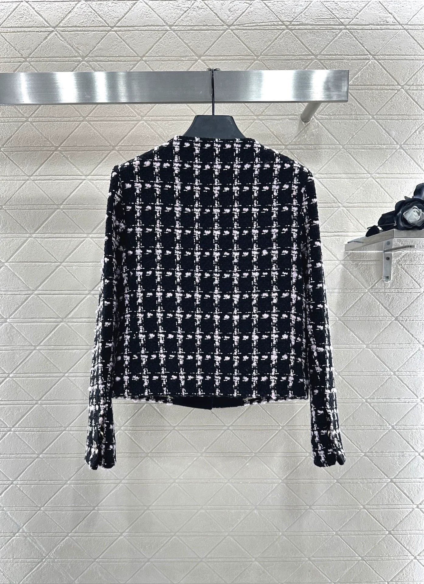 Woolen woolen fabric with obvious texture visible to the naked eye, superior texture with coarse floral stripes. Made of woolen fabric, it creates a model of socialite style and a set of silhouette jackets. The front placket is single row printed with engraved round buttons ➕ Exquisite pink black woven texture, luxurious yet elegant waist and pocket edges, plush fringe decoration, elegant and charming, rich design layering, matched with the same series of micro A straight tube half skirts