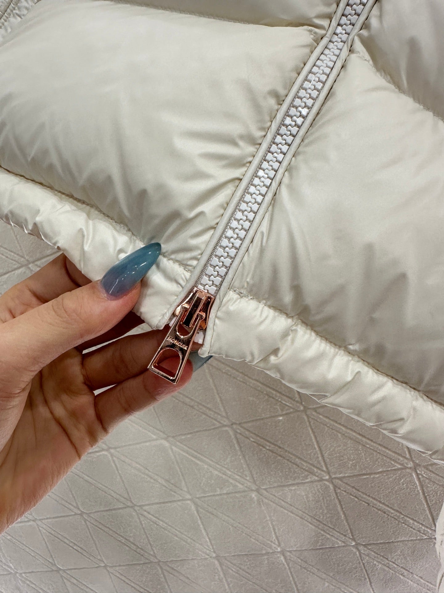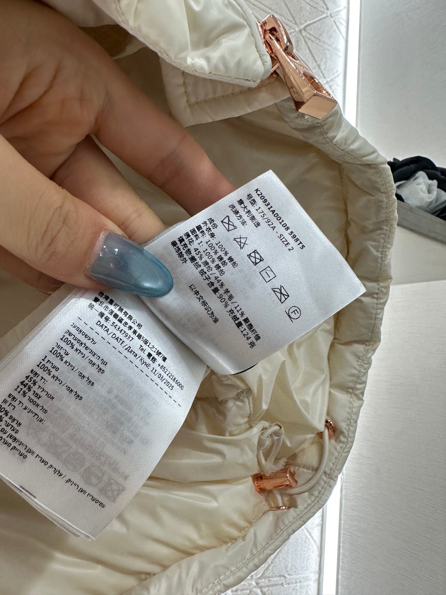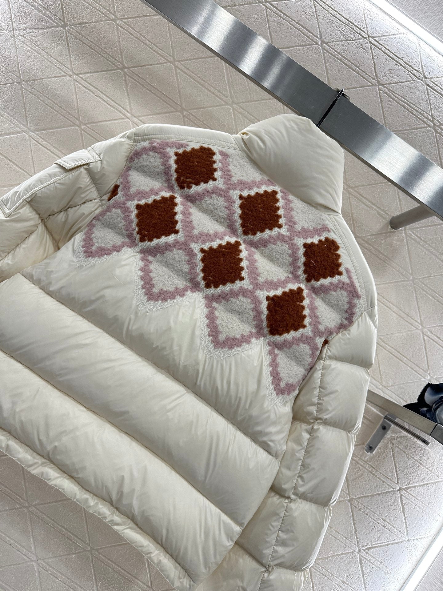 The upper layer of the shoulders and chest is decorated with knitted plush embroidery material, decorated with red and pink diamond grid patterns. The body is spliced with windproof nylon material, which collides with the material and exudes a fashionable and stylish style. The stand up down jacket is cut with a full sense of design, and the flap pocket on the outer side of the arm is matched with embossed badges, showcasing the brand's style. The rectangular embossed down is filled with down, and the overall silhouette is upright. The loose fit is unique with embroidered splicing design, making it fashionable and stylish to wear. It is the first choice for autumn and winter wear, and can be worn alone or stacked.