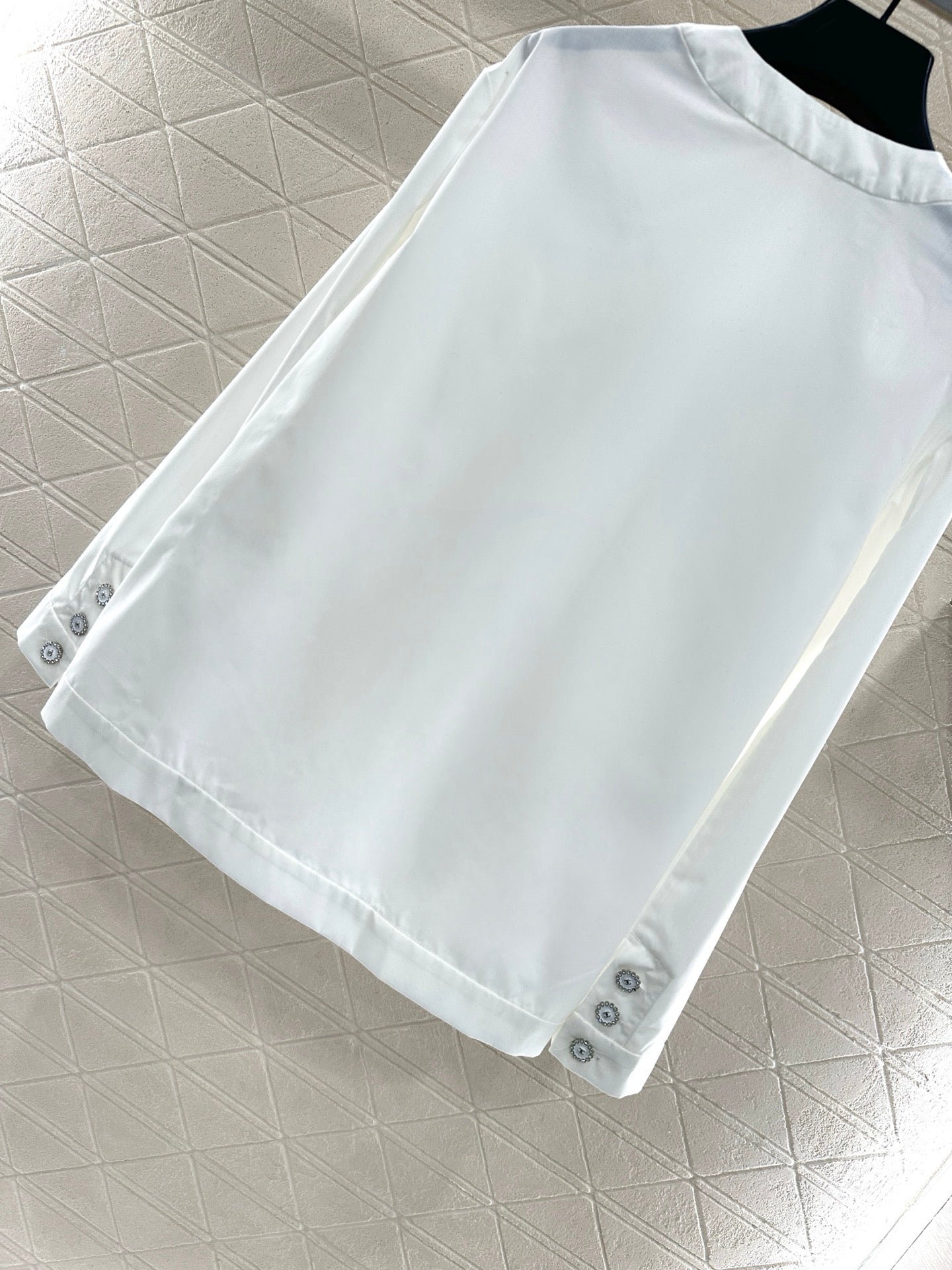 The twill cotton material is comfortable and delicate in texture, with full breathability. The round neck jacket and wide leg pants cover are cut neatly and slim, and the overall plain color is low-key, versatile and durable. The symmetrical design of the four pockets on the top and bottom of the body is embellished with the rhinestone double C letter logo, which echoes with the placket, giving it a fashionable feel. Paired with wide leg straight leg pants from the same series, the three-dimensional cut provides a loose and spacious silhouette, making it more inclusive and flexible, showcasing a high-end style. When worn as a set, it effortlessly creates a stylish and sophisticated look.