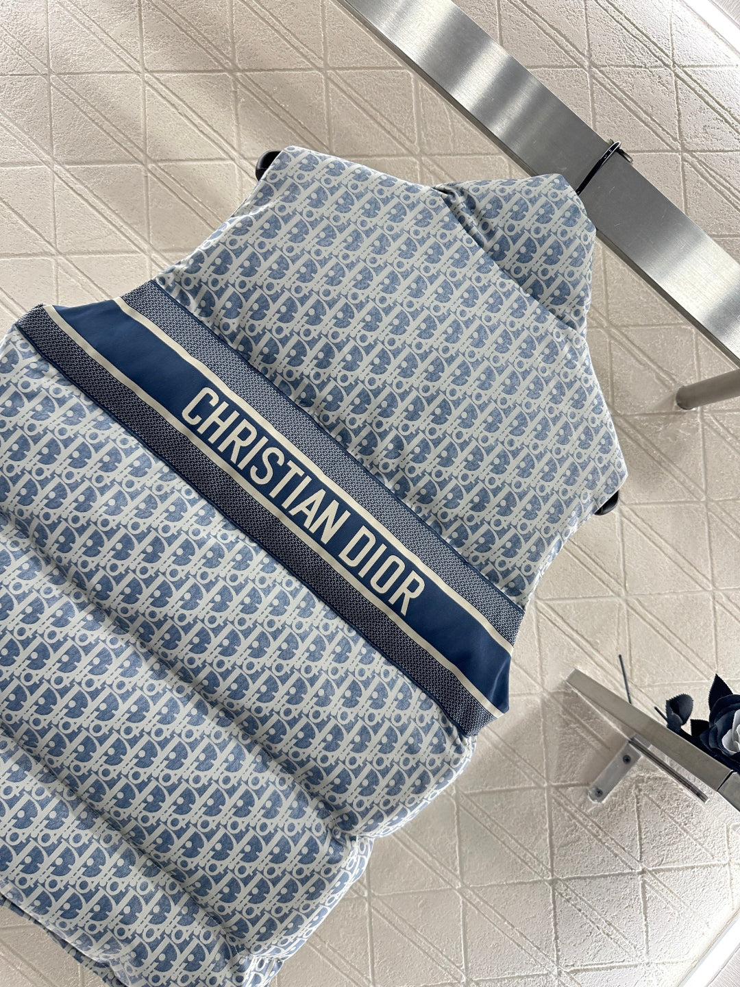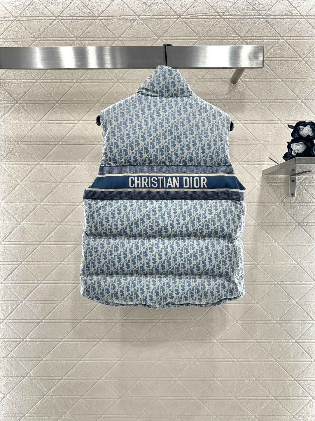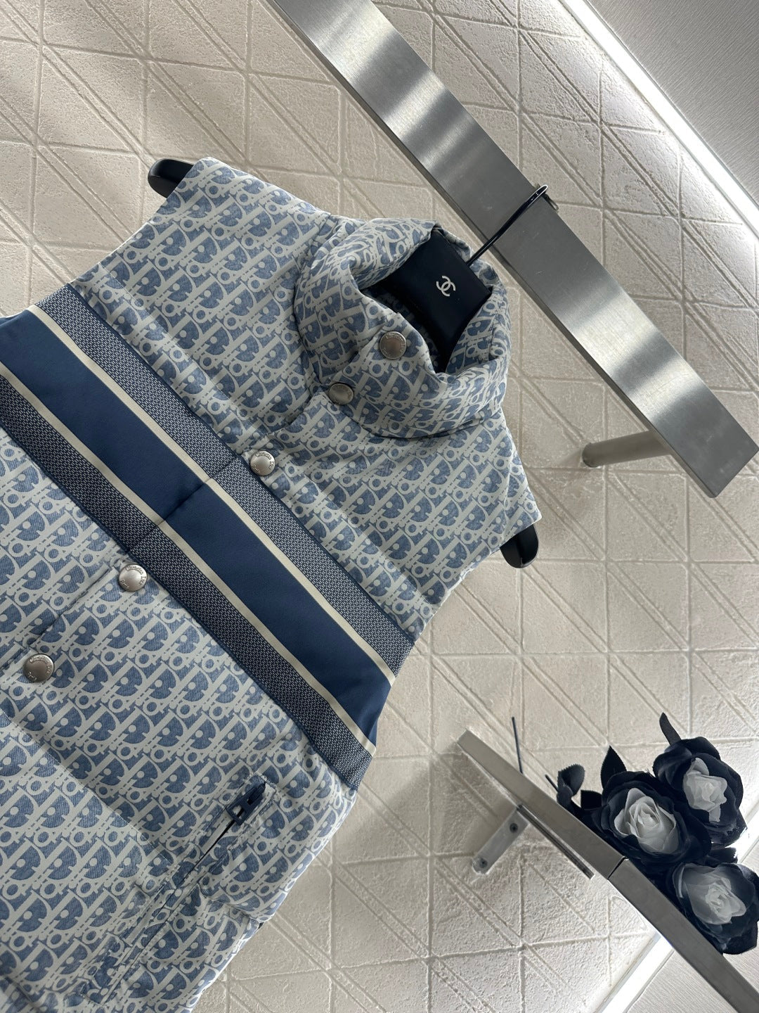Jacquard material, down filled interior, lightweight and warm overall, stand up collar fashionable vest, warm without appearing bulky, stronger wearability. Classic checkered texture, horizontal stripes on the chest contrasting with letter logo jacquard treatment, embroidered bee CD logo added, presenting a high-end style and taste, integrating warmth and fashion, breaking away from the traditional bulky down, the first choice for autumn and winter layering.