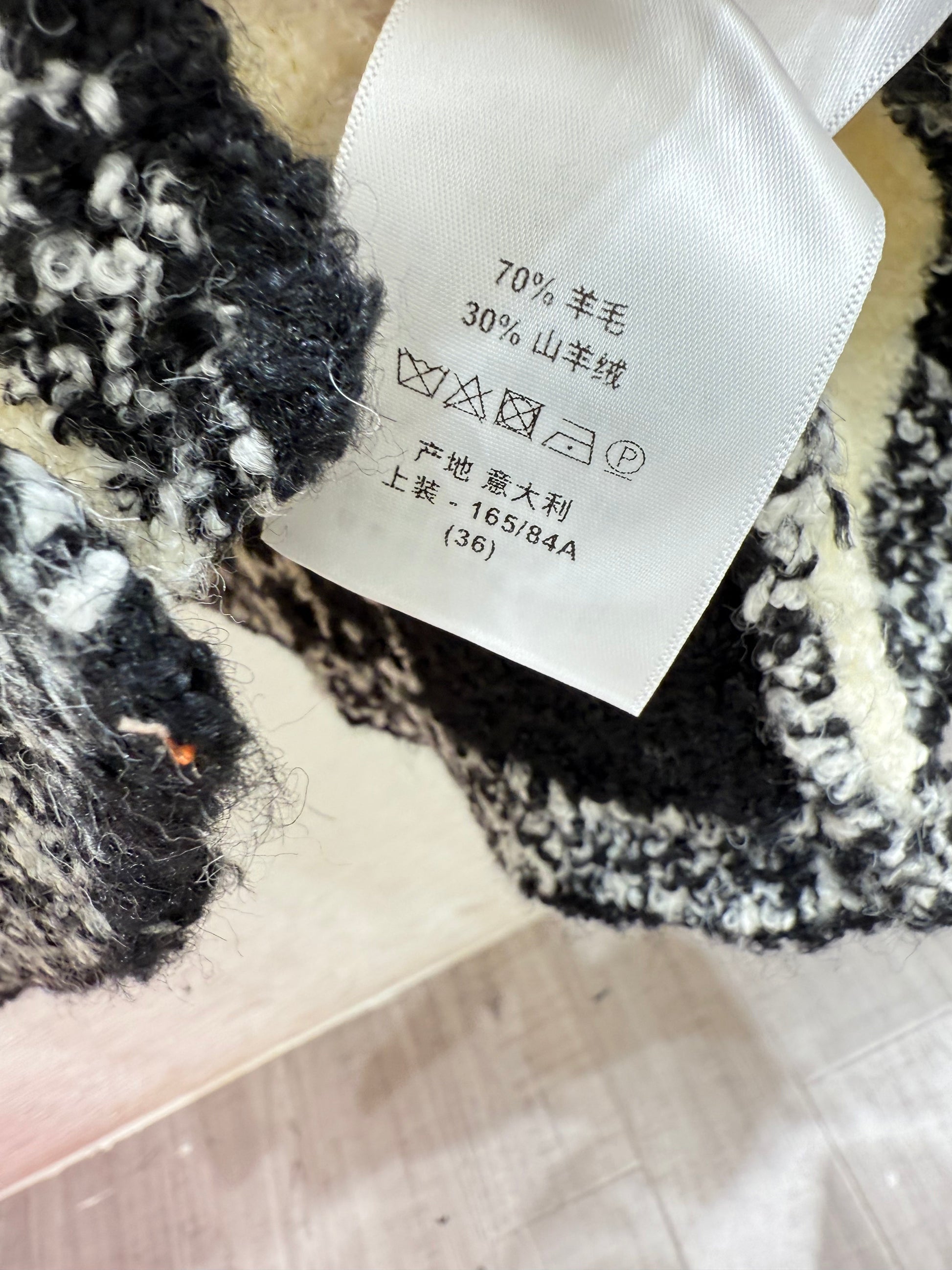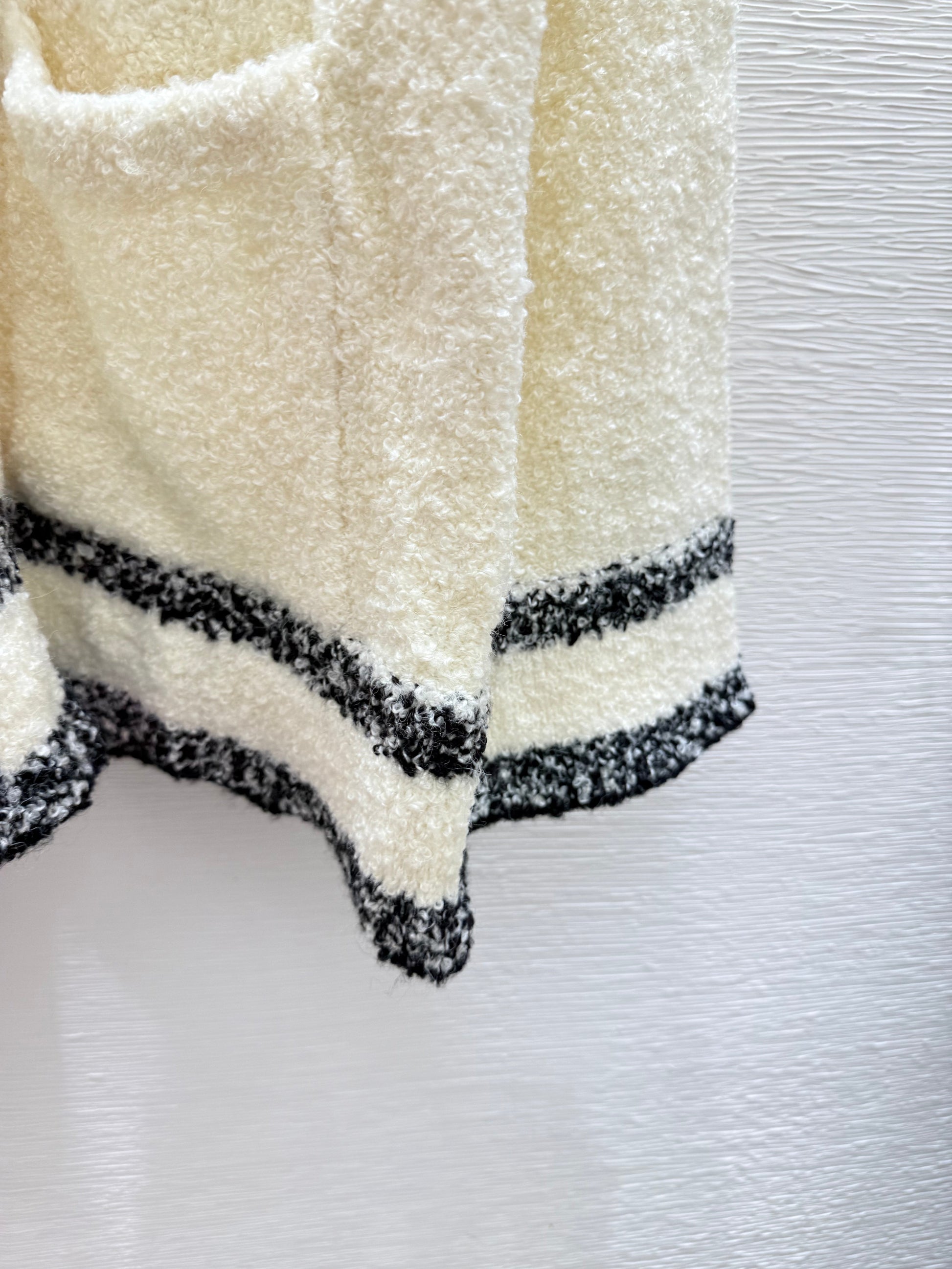 Classic beige color scheme, black striped decorative edge, stand up collar design, front button cardigan style. Soft and fluffy texture, warm and comfortable.