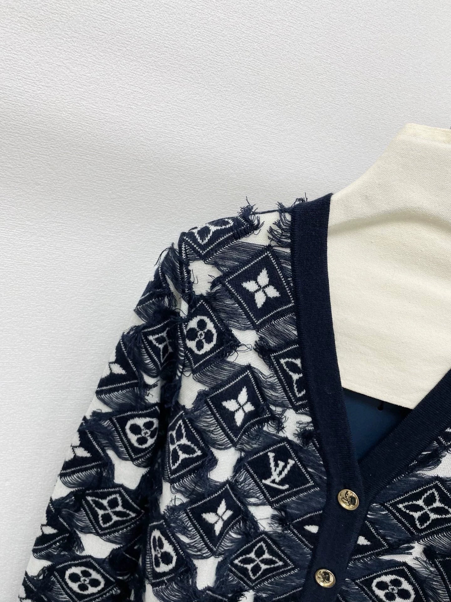 Deep blue and white color scheme, classic floral jacquard design, embellished with metal buttons. Fabric, soft and comfortable. V-neck design, front buckle, tassel decoration, stylish and atmospheric