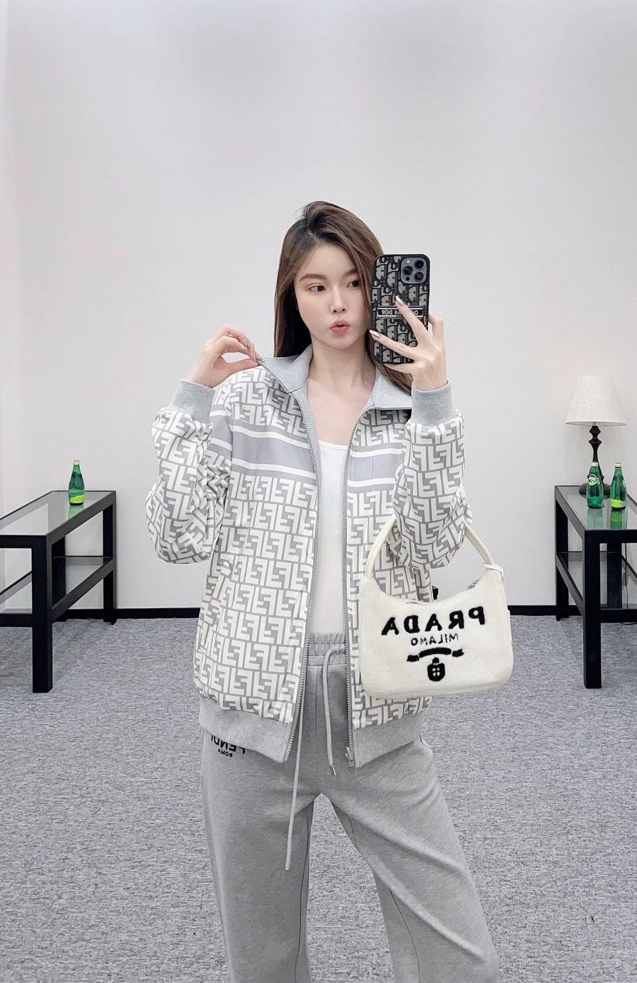 The twill cotton material has a glossy texture and is high-end. The regular lapel jacket has a zipper and adjustable placket, giving it a full sense of leisure. One side is plain with a letter logo, and the other side is fully covered with brand double F element printing, showing the brand's tone and matching with the same series of straight leg pants. The drawstring at thejacke waist is elastic and suitable for wearing. It has a simple and stylish style without losing its fashion sense
