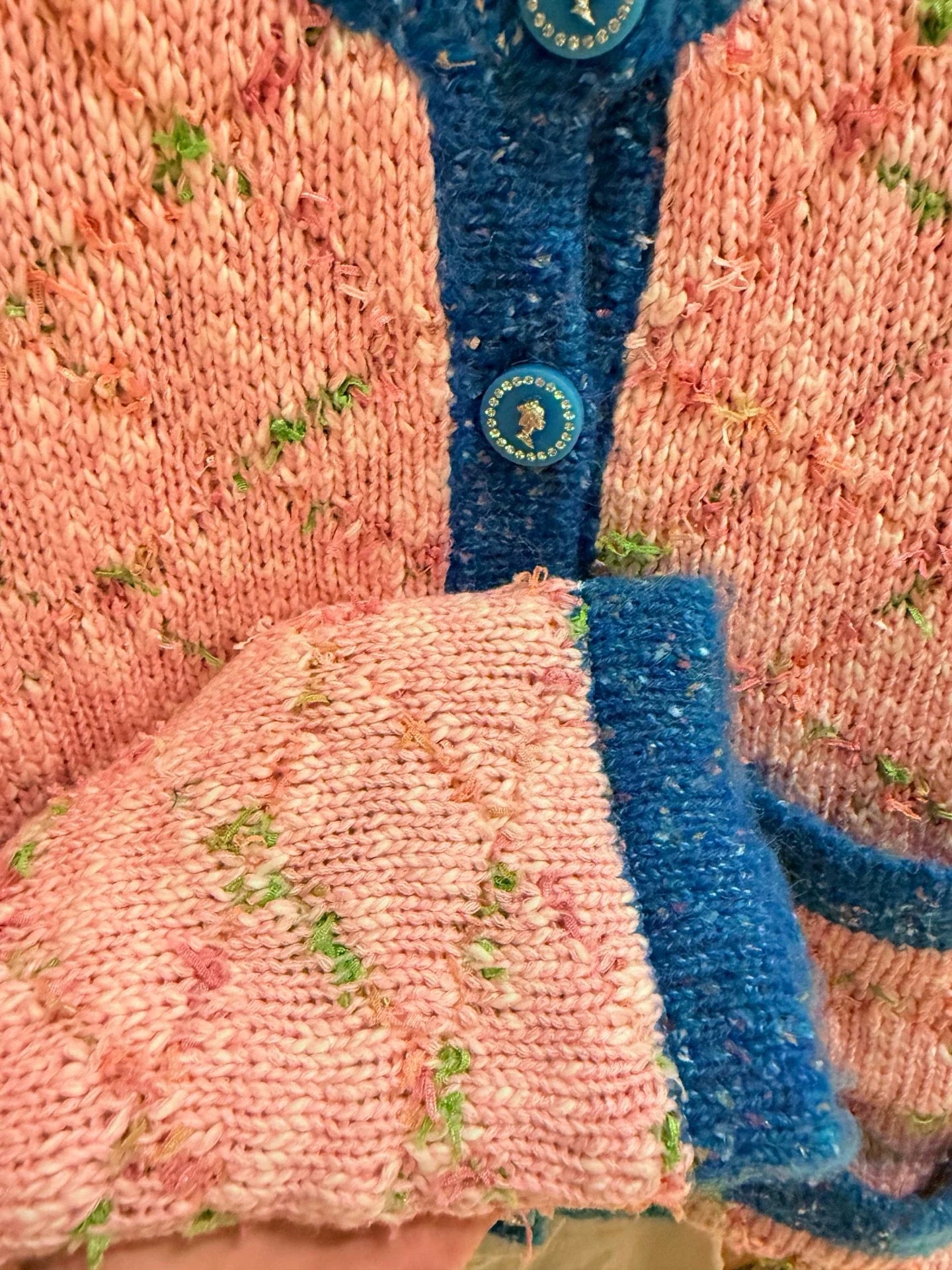 Pink main body with blue border decoration, exquisite pattern embellishment, single breasted design, round neck long sleeved style. The fabric is soft and comfortable, and it looks great when paired with skirts and pants, fresh and sweet. Suitable for wearing in spring and autumn seasons