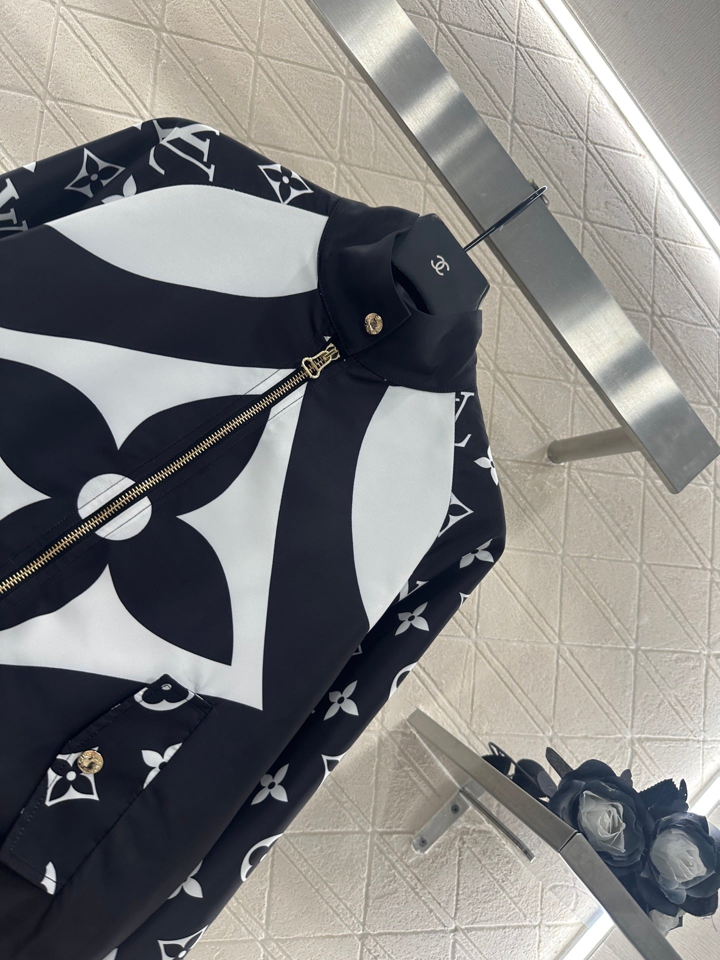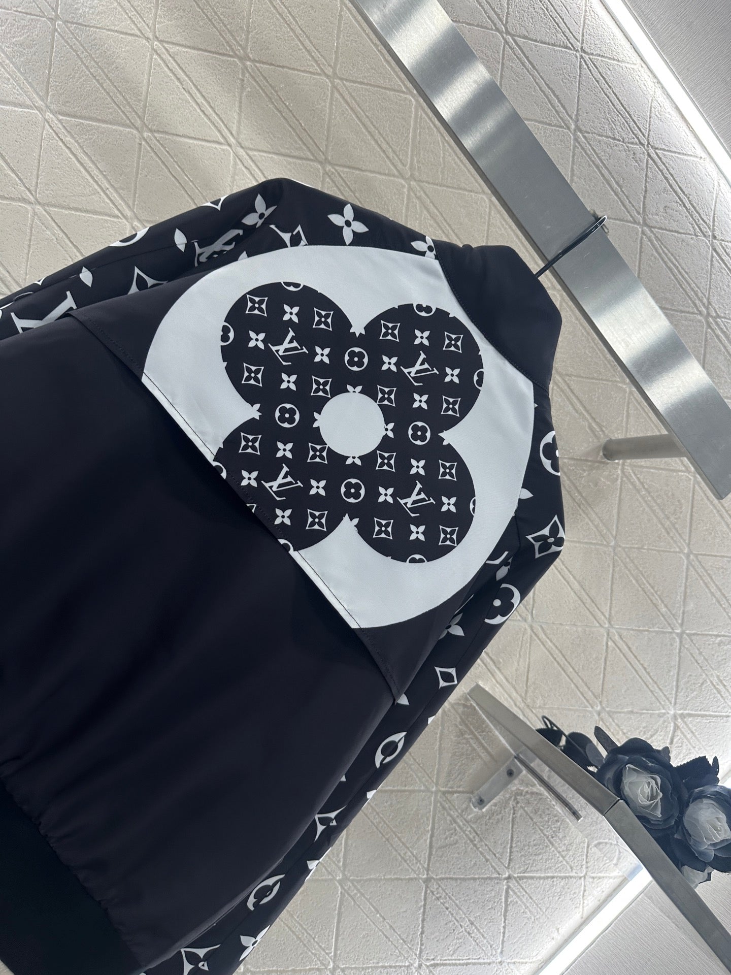 Nylon material texture, glossy, crisp and stylish zipper jacket, long pants set, open zipper ➕ Elastic thread edging, adjustable cuffs and hem for easy on and off, plain color throughout the body ➕ The four leaf clover element and letter pattern are the highlights, combined with the large four leaf clover on the chest to highlight the high-end positioning and add a sense of casual fashion. The matching of the same series of leg binding pants with partial printing echoes up and down