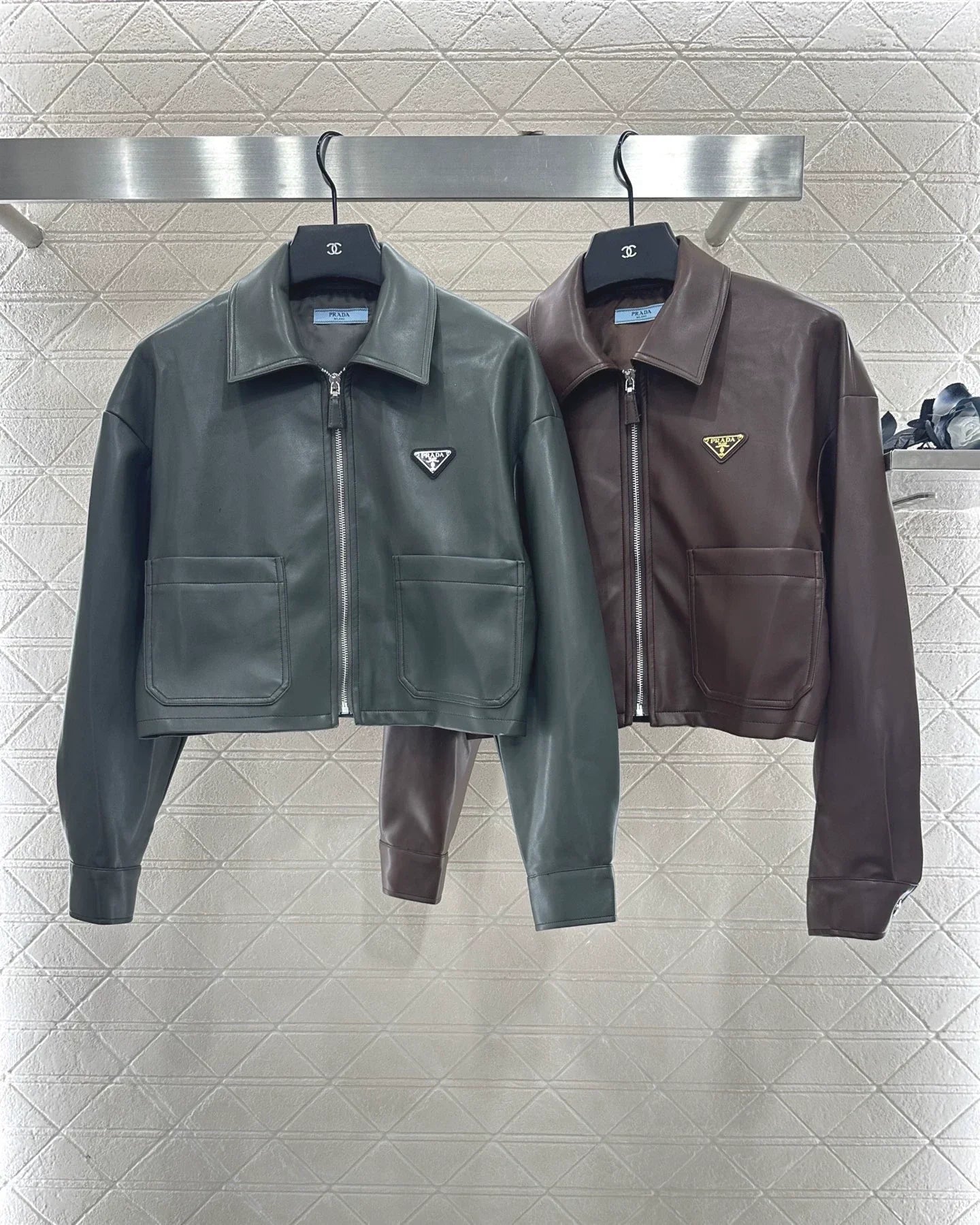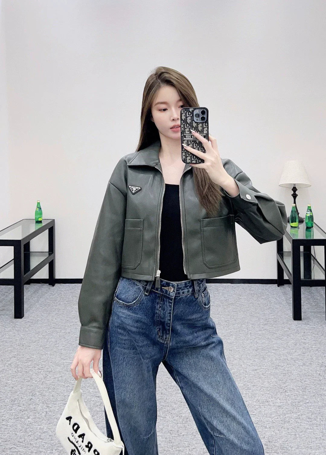 Environmentally friendly washed leather material, delicate texture, clear texture, short lapel jacket version, matched with silky zipper, classic metal texture makes the handsome motorcycle feel full, the upper body is cool while modifying the body shape, the chest is decorated with a metal triangle logo, showing style, a must-have for sweet and cool girls