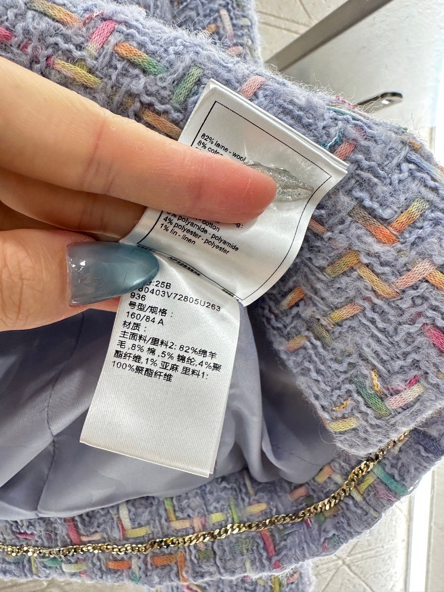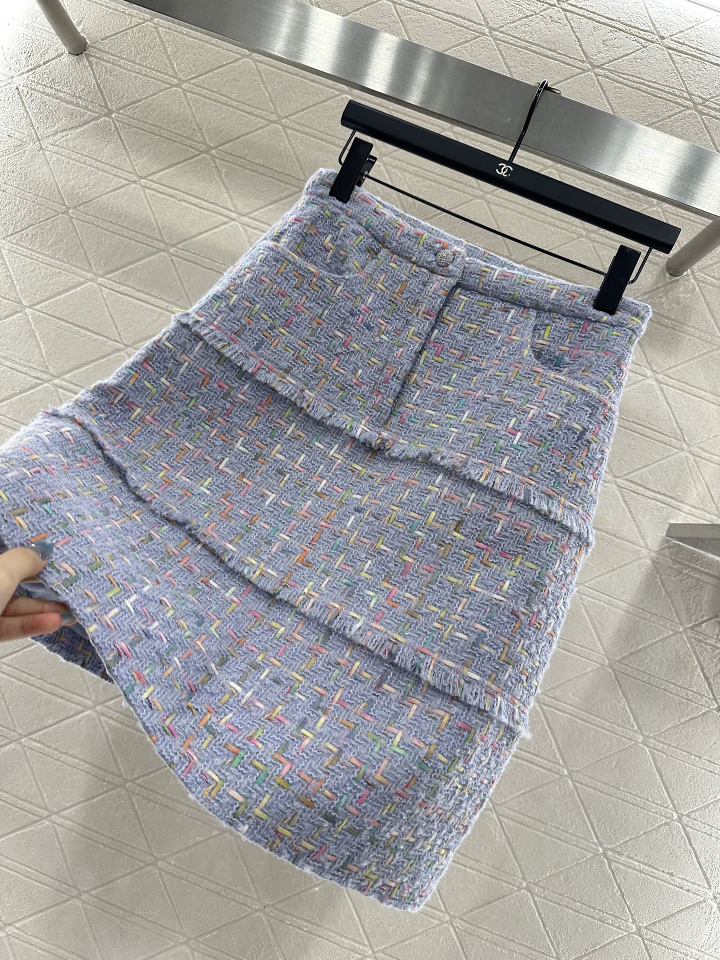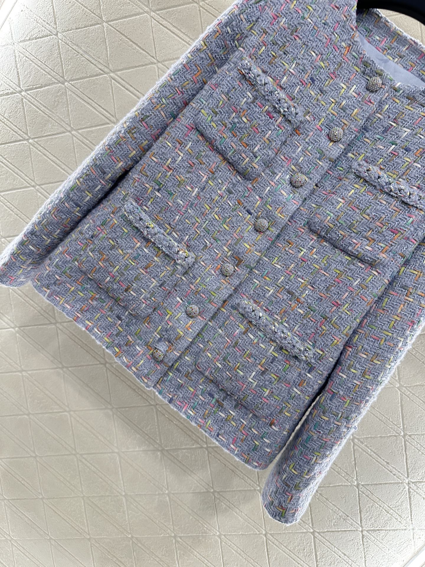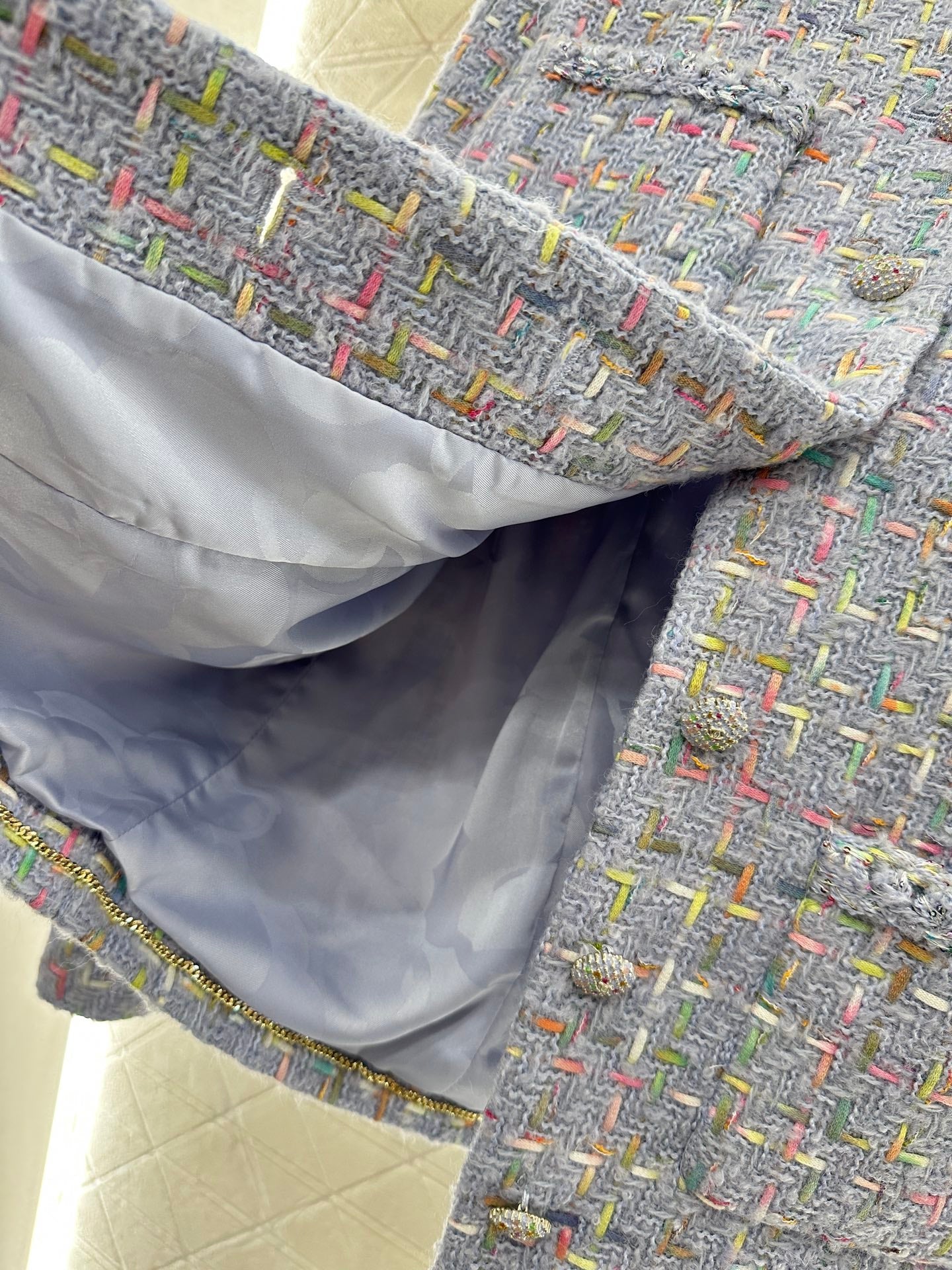 Made of high-quality woolen fabric, with a full appearance, this round neck dress has a tailored design that fits the human body. The shoulder pads on the front of the garment are designed to enhance the slender and upright figure. The large body has multiple pockets, and the three-dimensional weaving edge lights up the details. The blue purple base color, combined with delicate colored yarn rules, interweaves the texture and covers the whole body, highlighting the socialite's style. The same series of straight tube skirts have multiple layers of wool details, perfectly interpreting the elegant and luxurious feeling. The complete set highlights the texture and is intellectual and gentle, making it the perfect choice for attending formal occasions