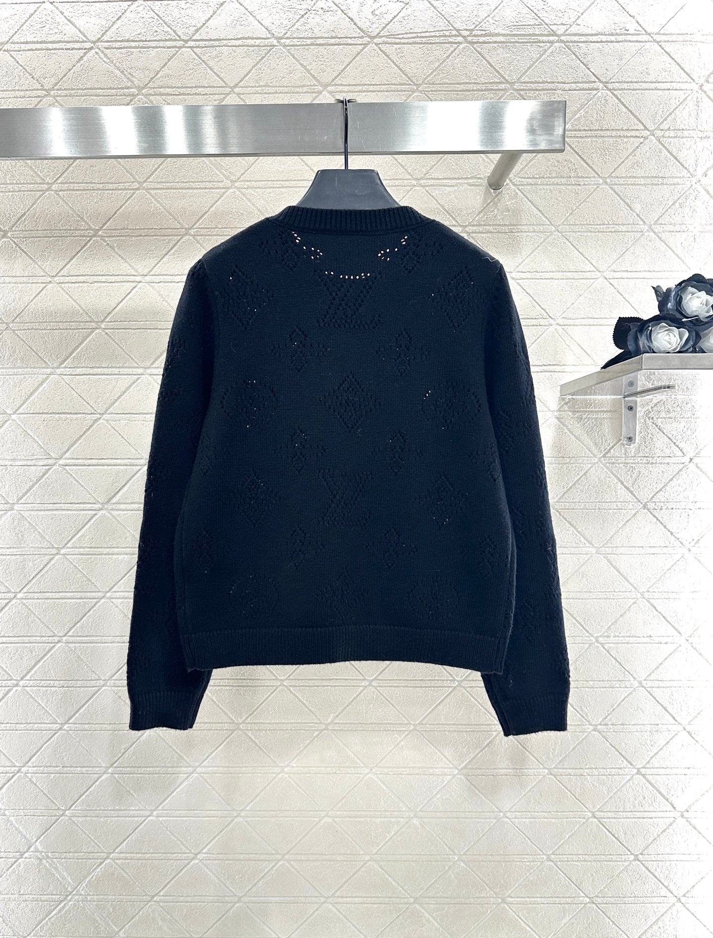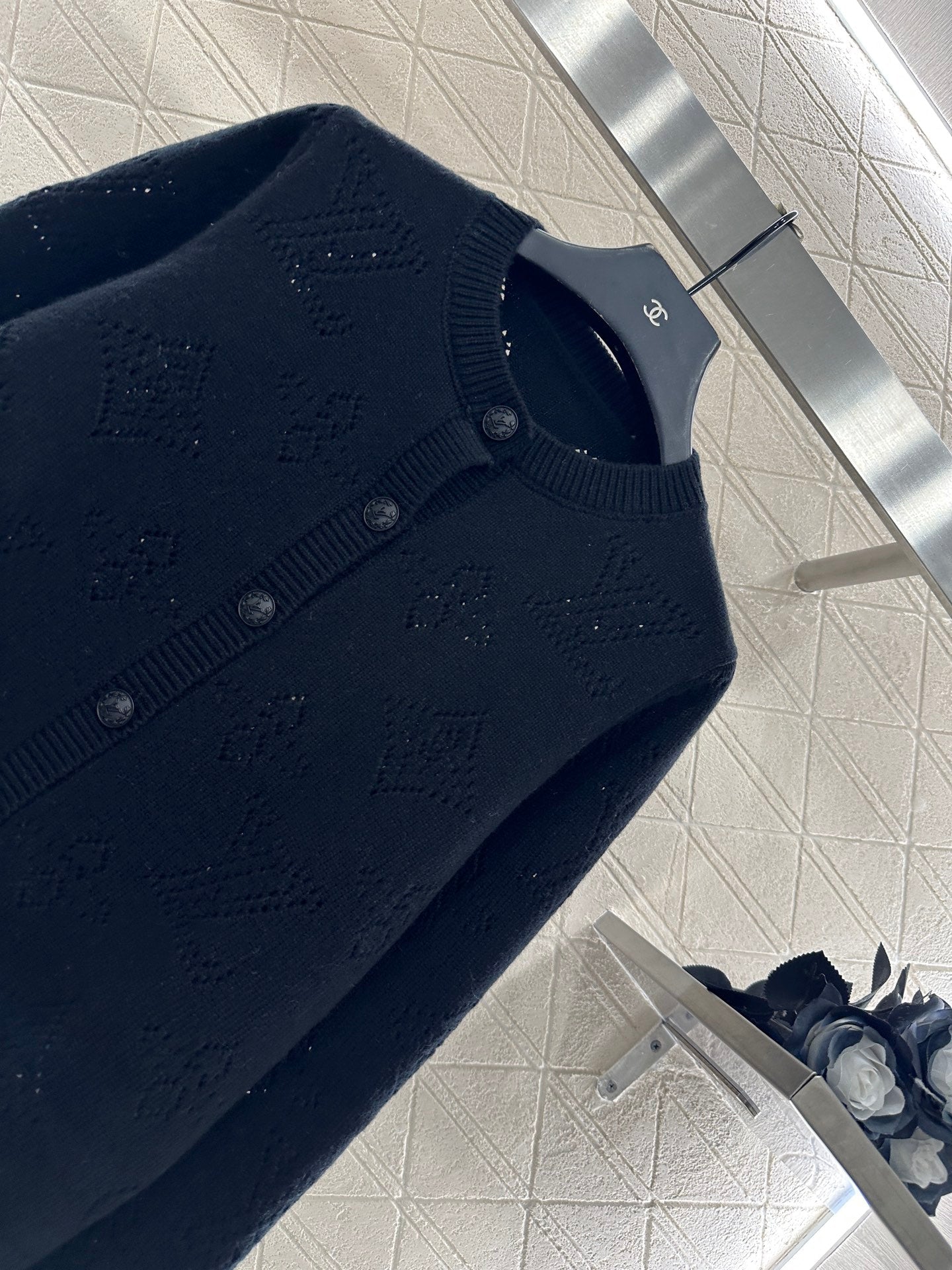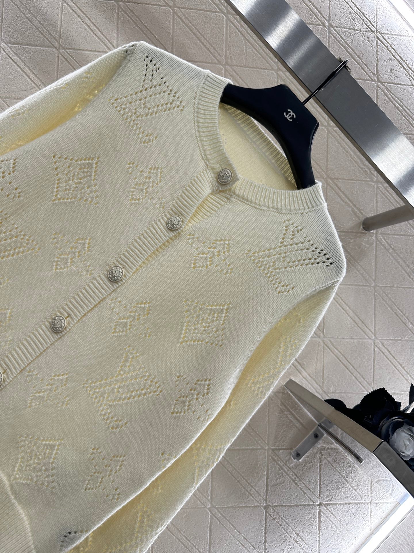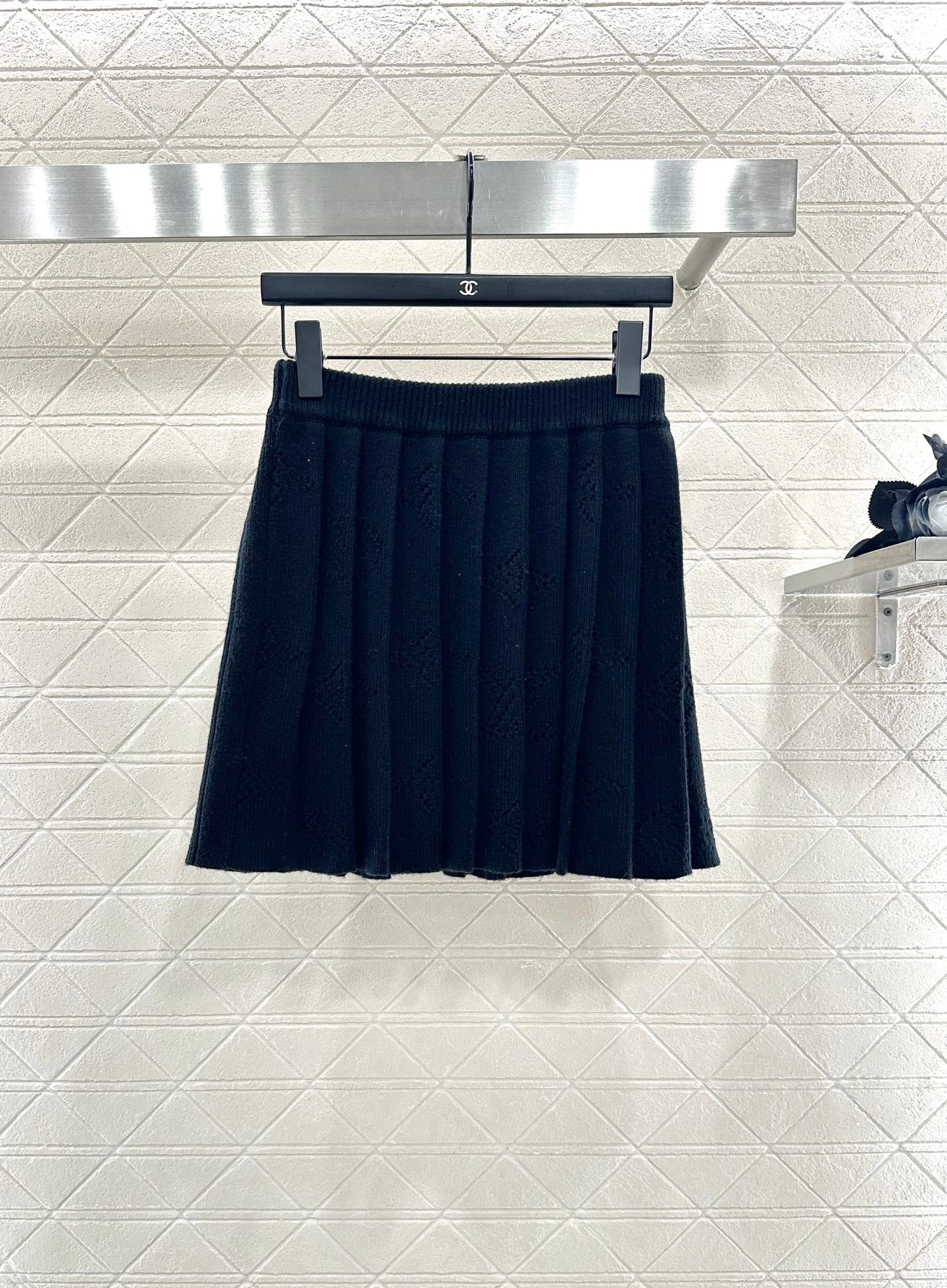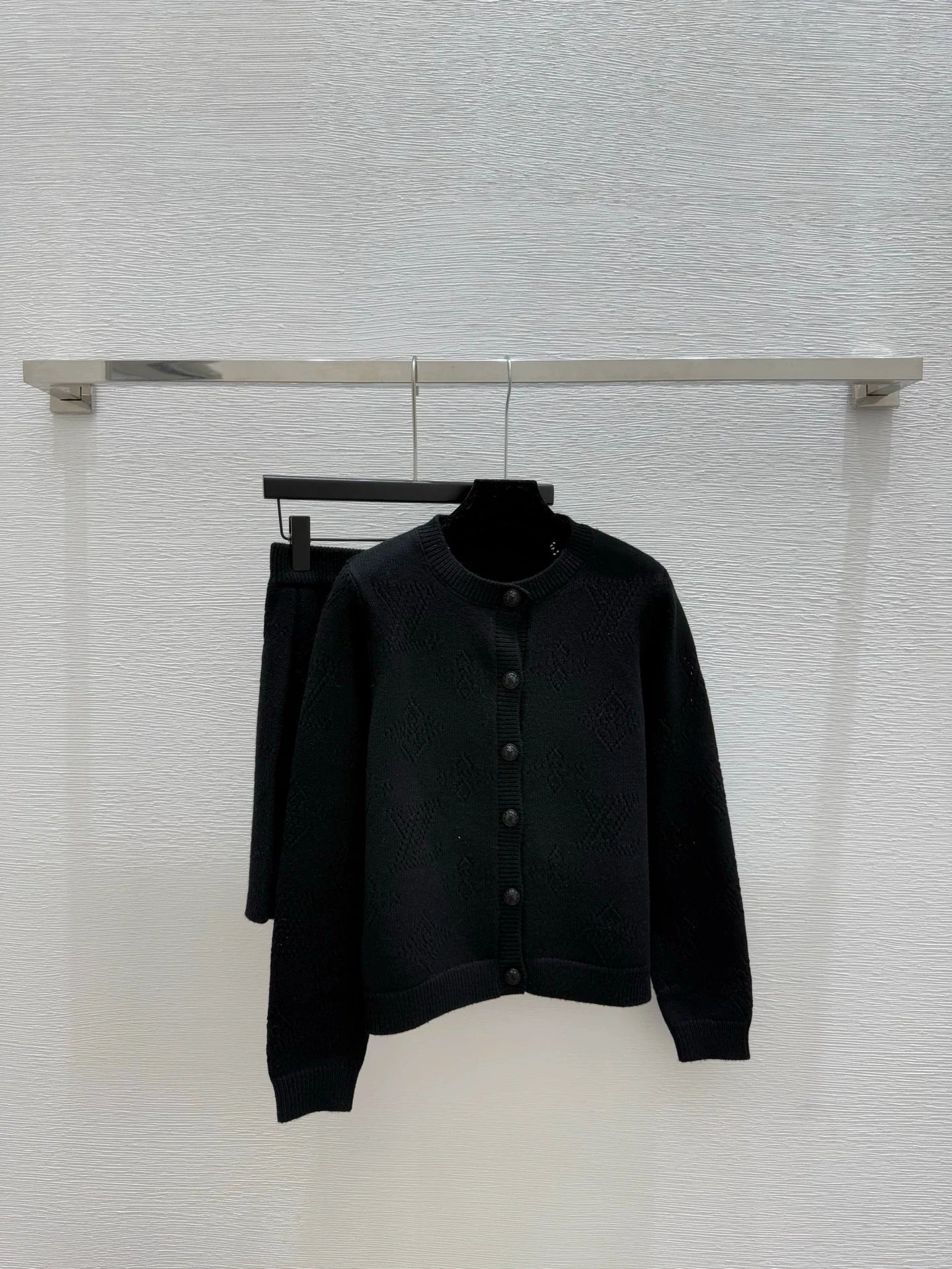 Woolen yarn weaving, jacquard processing, presenting a hollow shape, knitted round neck cardigan version, finished garment button decoration cardigan, with elastic groove thread edging to narrow, letter clover logo buckle design to maintain a unified tone, the overall shape is high-end and casual, matched with the same series of elastic high waisted pleated short skirts, collision creates a fashionable tone, creating the brand's unique fashionable style.