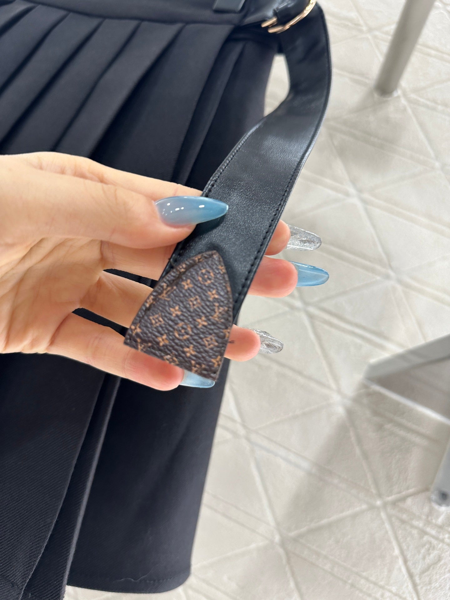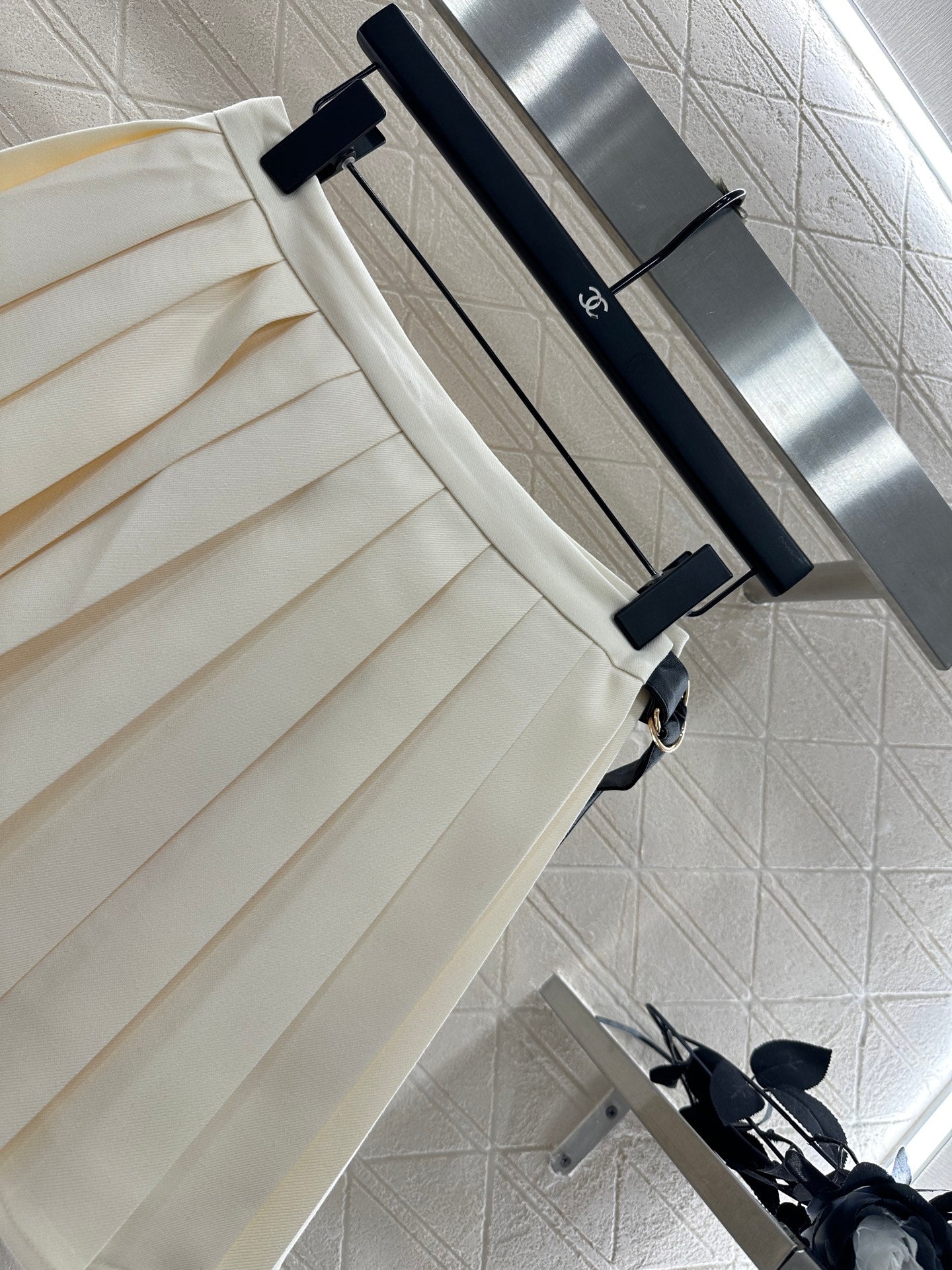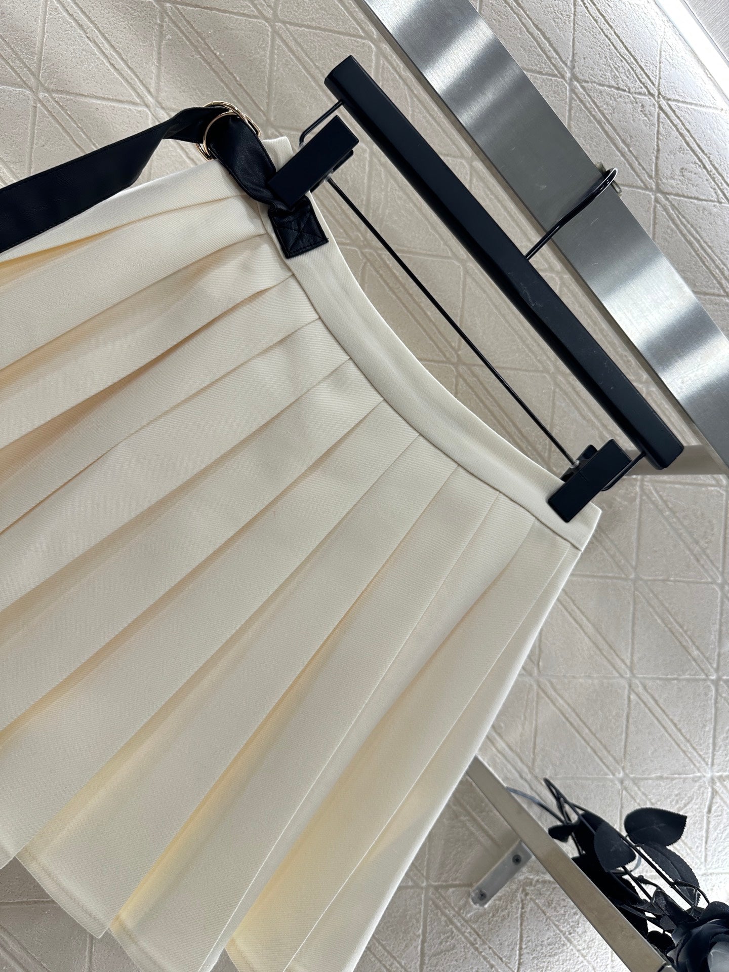 Exquisite imitation wool material, glossy and comfortable texture, superior cutting, smooth and flowing high waisted pleated short skirt, neat and pleated design, and hip contour. One piece front cover with leather buckle fixed on one side at the end of the waist, embellished with leather clover letter logo, highlighting the brand style. Wearing college, reducing age, length, trimming proportion, revealing slim waist and long legs, showing high knowledge temperament and style