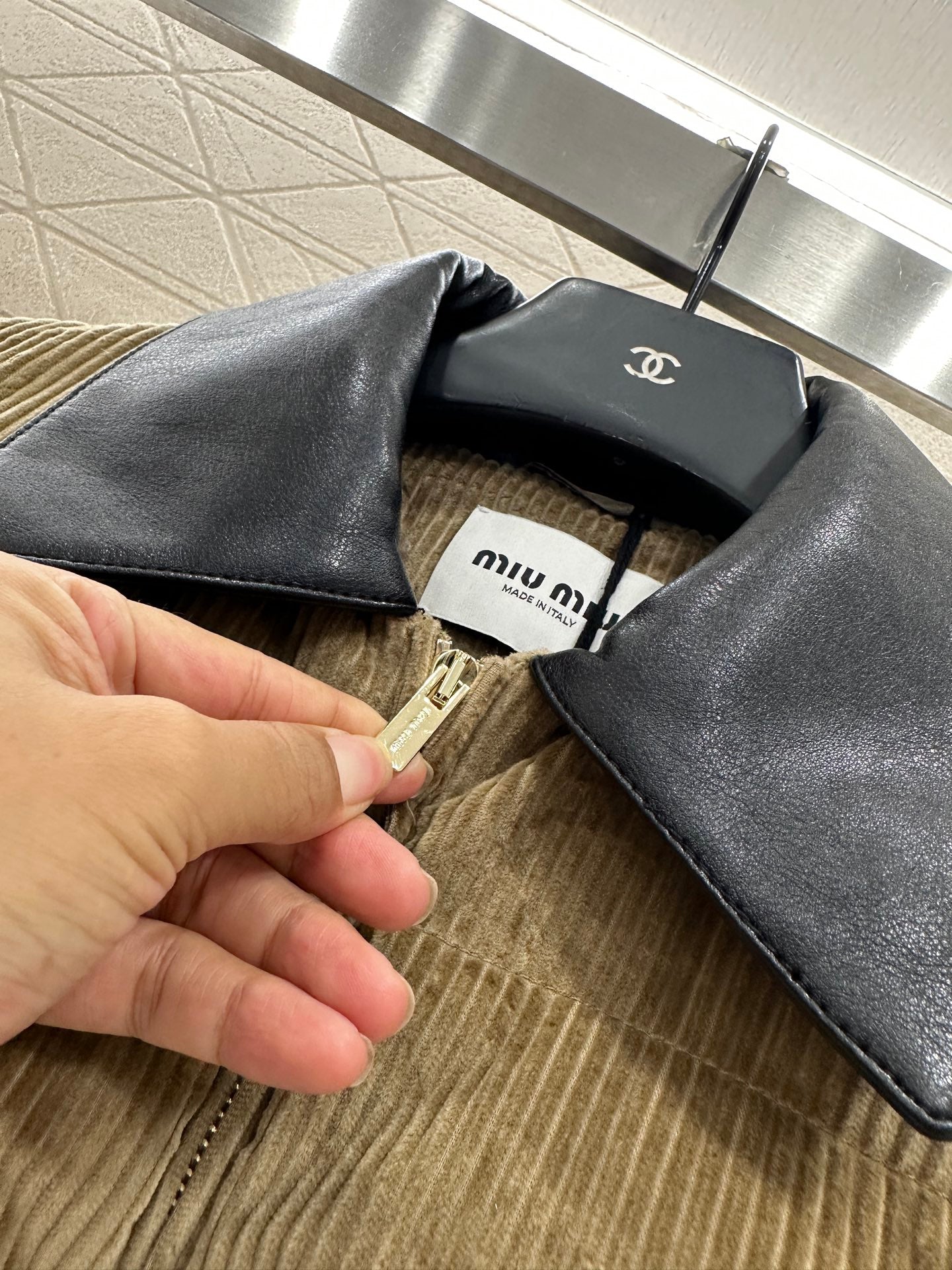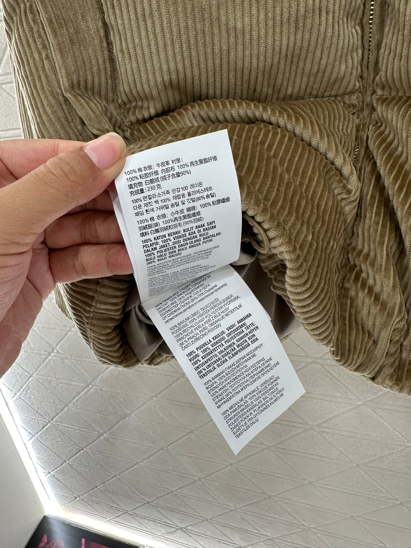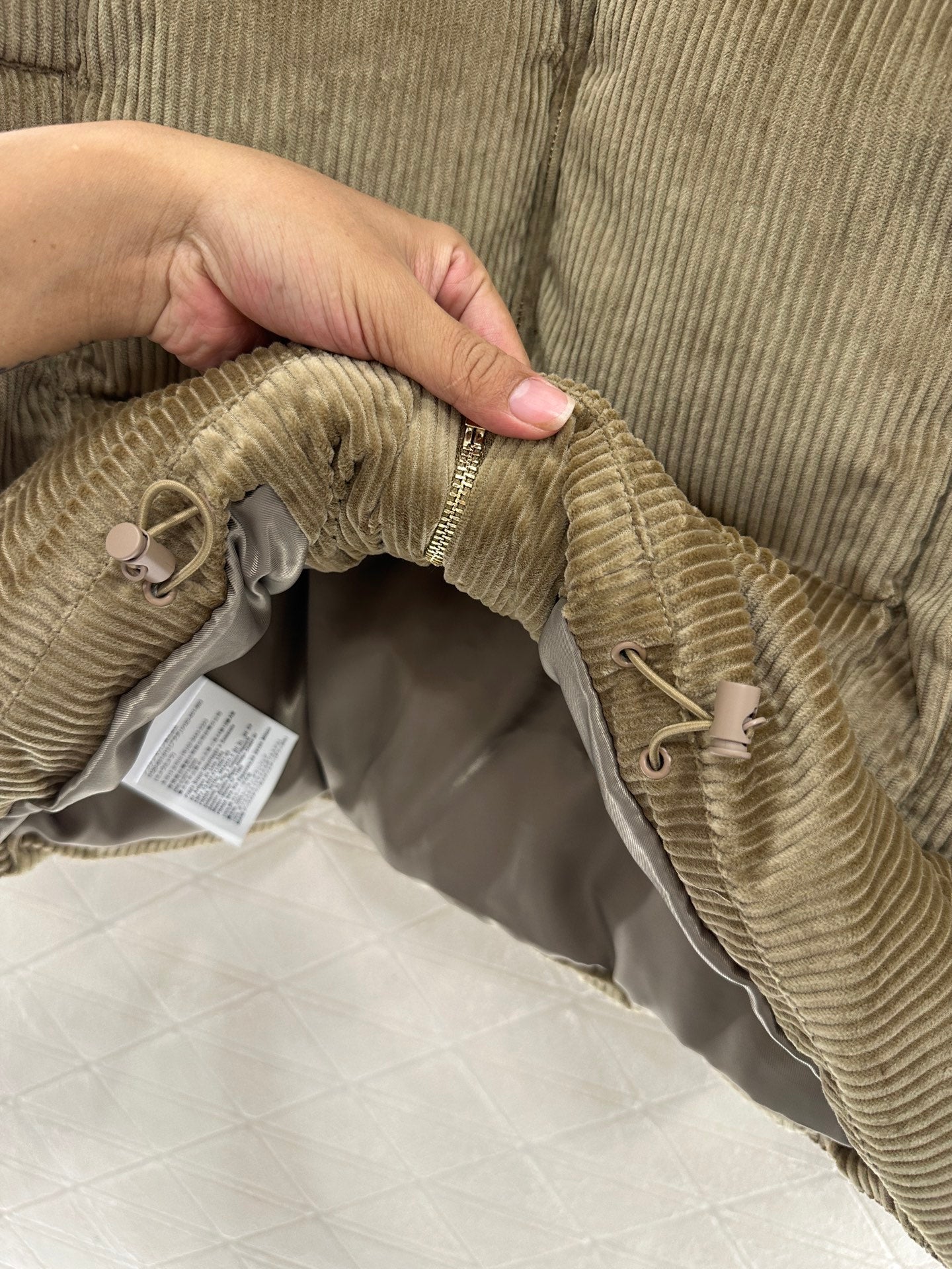 Made of corduroy fabric with white down filling, this piece is lightweight yet warm. The genuine leather lapel design creates a striking color and texture contrast with the main body's brown-yellow hue, delivering a bold aesthetic. The outerwear features a rectangular embossed silhouette, while the large-capacity side pockets add three-dimensional depth to the look. A signature letter monogram adorns the chest, embodying the brand's philosophy. With adjustable drawstring and zipper details for effortless on-and-off wear, this jacket offers a lightweight, stylish fit perfect for pairing with jeans or casual trousers in autumn and winter—combining warmth and fashion in one.