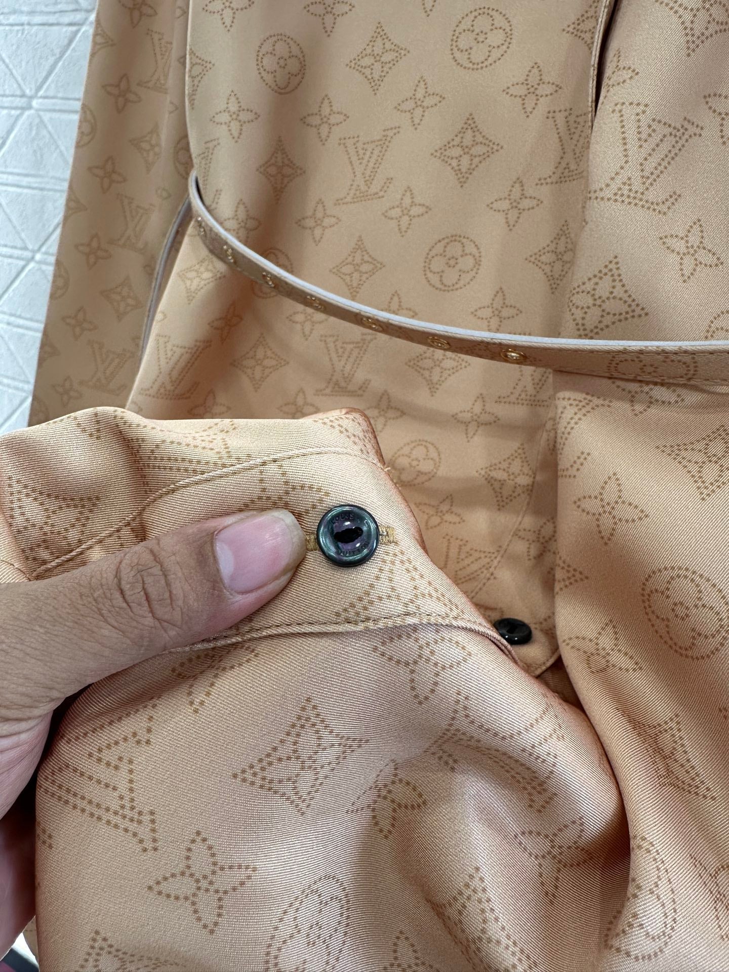 The twill thick material has a comfortable and delicate texture. The waist cinching dress has a sleek and slim fit, with a V-shaped button open collar and a straight cut waist belt for a slimming effect. The short style is agile and elegant, highlighting the waistline and hips. The whole body is covered with four leaf clover elements and letter patterns, highlighting the brand's delicacy. Combined with the chest pocket, the upper body is full of fashionable and elegant atmosphere, perfect for daily commuting and vacation.