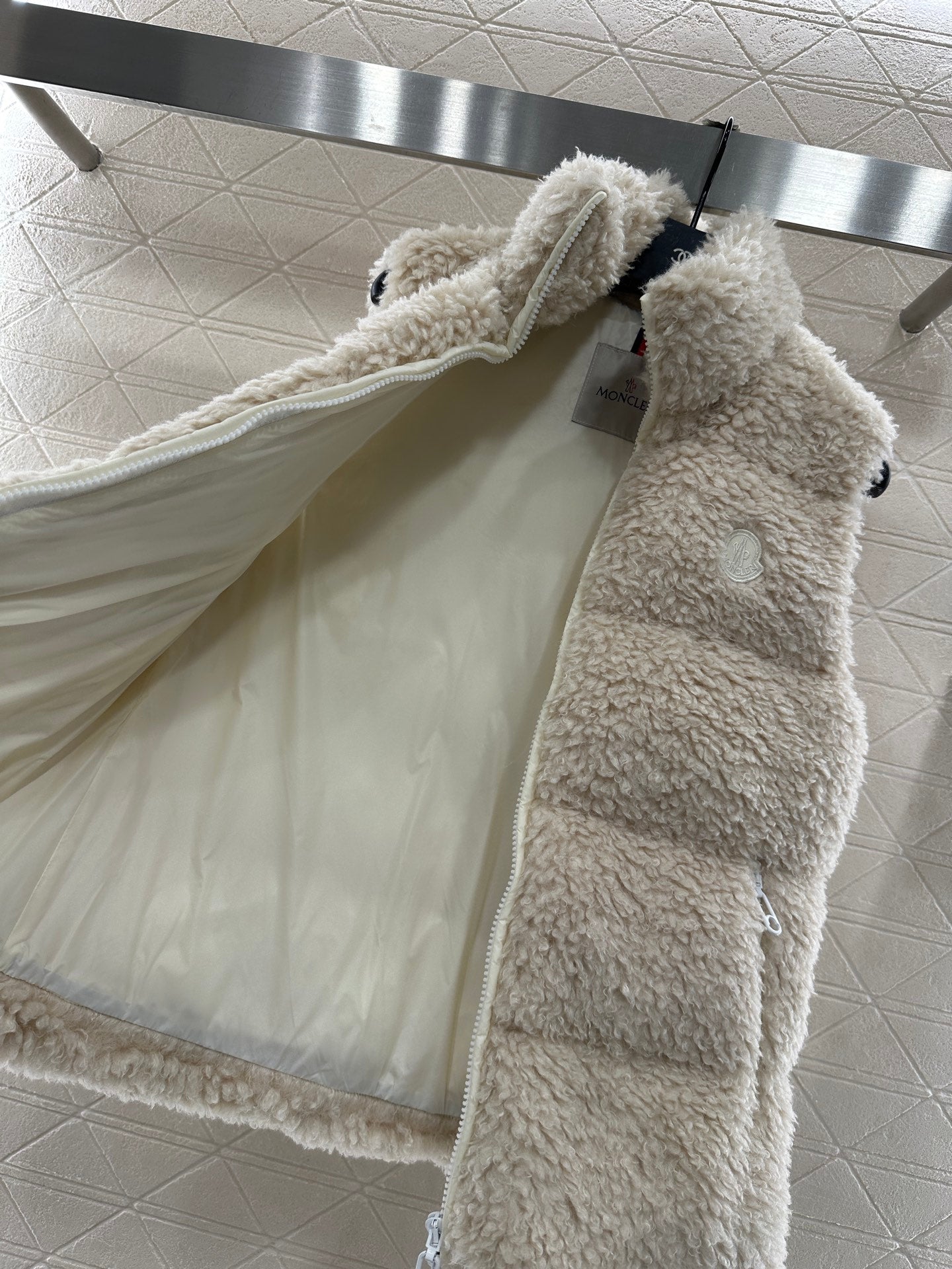 The outer layer is decorated with three-dimensional fluffy teddy plush material, which is soft and comfortable in texture. The hooded zipper vest cut is fashionable and stylish, and the chest badge shows the brand style. The overall silhouette is upright, slim fit, with a furry feel and zipper pockets ➕ Elastic elastic band enhances the convenience and practicality of on and off, giving it a stylish and sticky look. It is the first choice for keeping warm in autumn and winter.